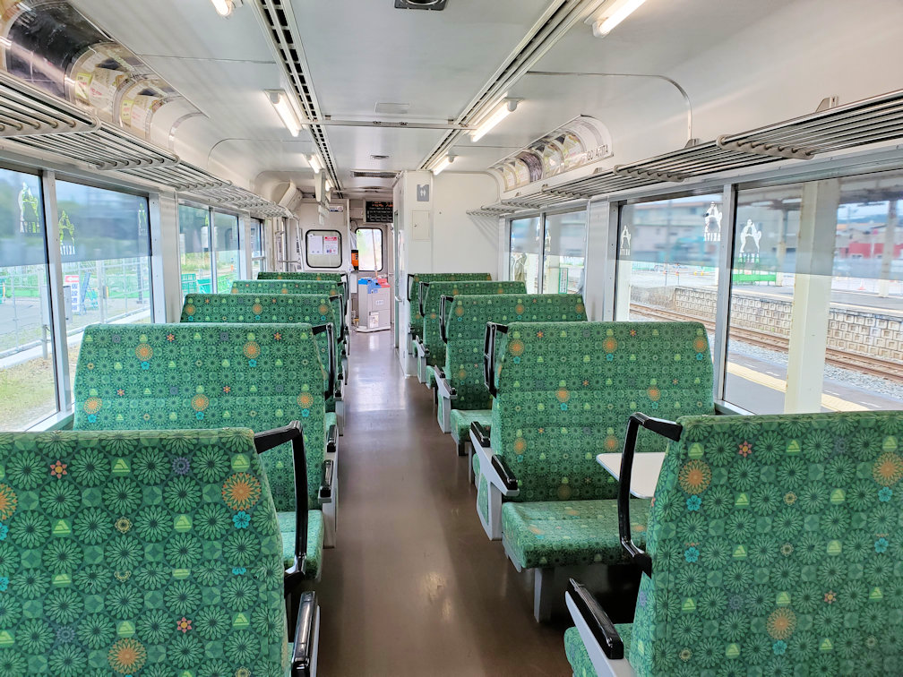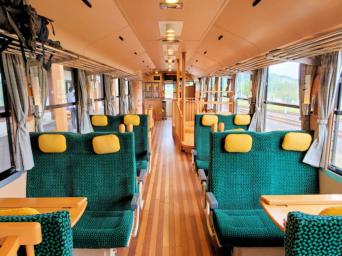 帰りは矢島駅0940発の羽後本荘行きに乗る。この列車は「おこば列車」と呼ばれる観光列車仕様で、車内は観光列車風のレイアウトになっている。専門のアテンダントさんも乗務しており、旅の雰囲気を盛り上げる。