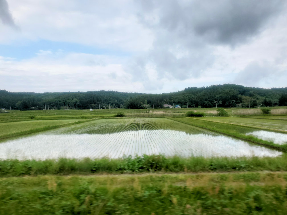 代行バスはほぼ予定通りに新庄駅に到着。ここから1500発の快速列車「ゆけむり」に乗る。この列車は陸羽東線を経由して小牛田までいき、そこからは東北本線を南下して仙台に至る。これも観光列車で見た目はそれっぽい感じだが、車内はやや旧式。キハ110系の改良型で、車内は全て転換式クロスシートとしてある所が観光列車ぽい所。あと、車販嬢が乗務しており、アルコールやソフトドリンクなどを車内で買うことができる。この路線も既に何度か乗ったが、これまでは秋や冬に乗ることが多かった。今回のような初夏に乗るのもまた悪くないな。新緑と渓谷、そして水の張った水田が美しいと思う。