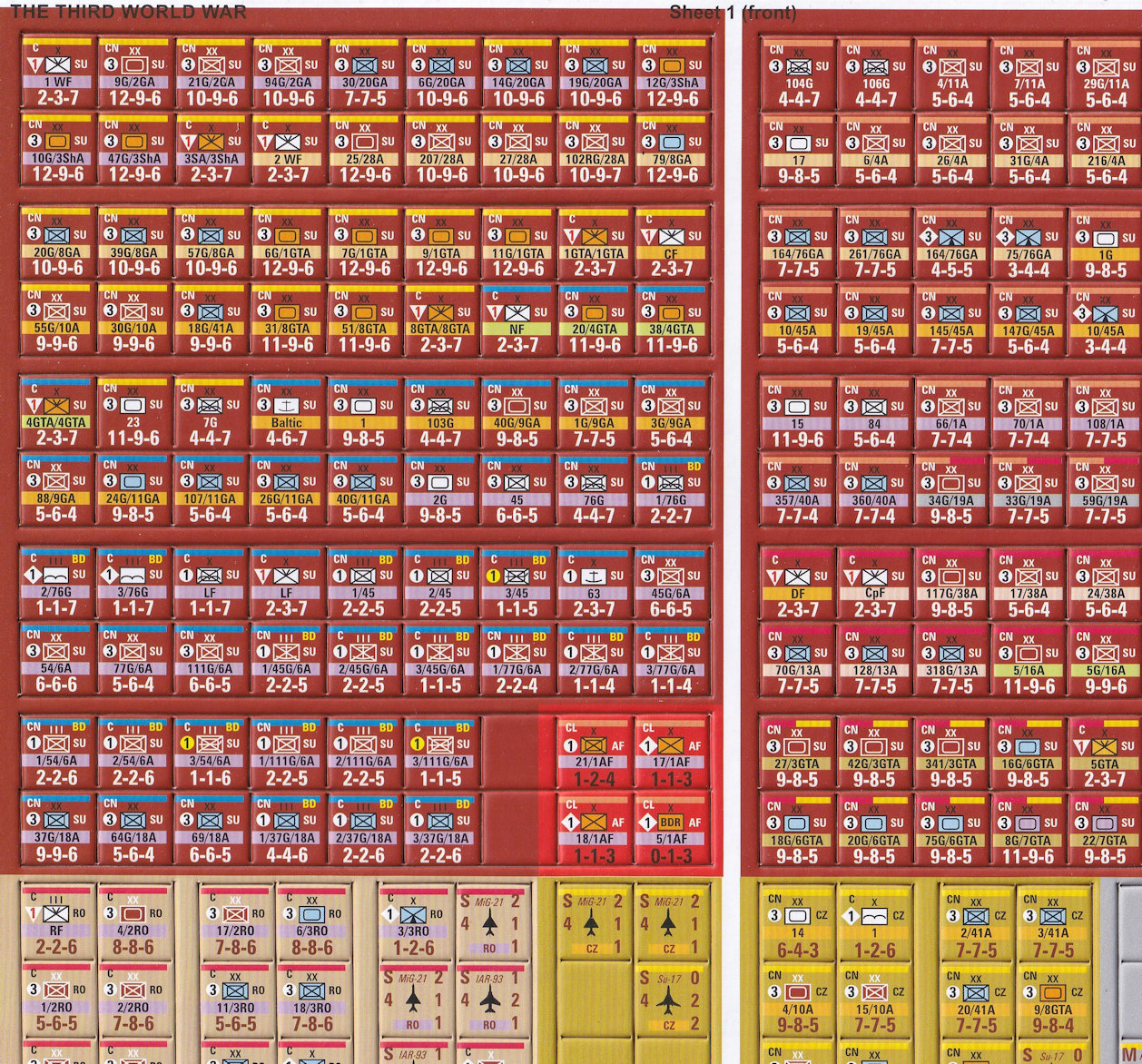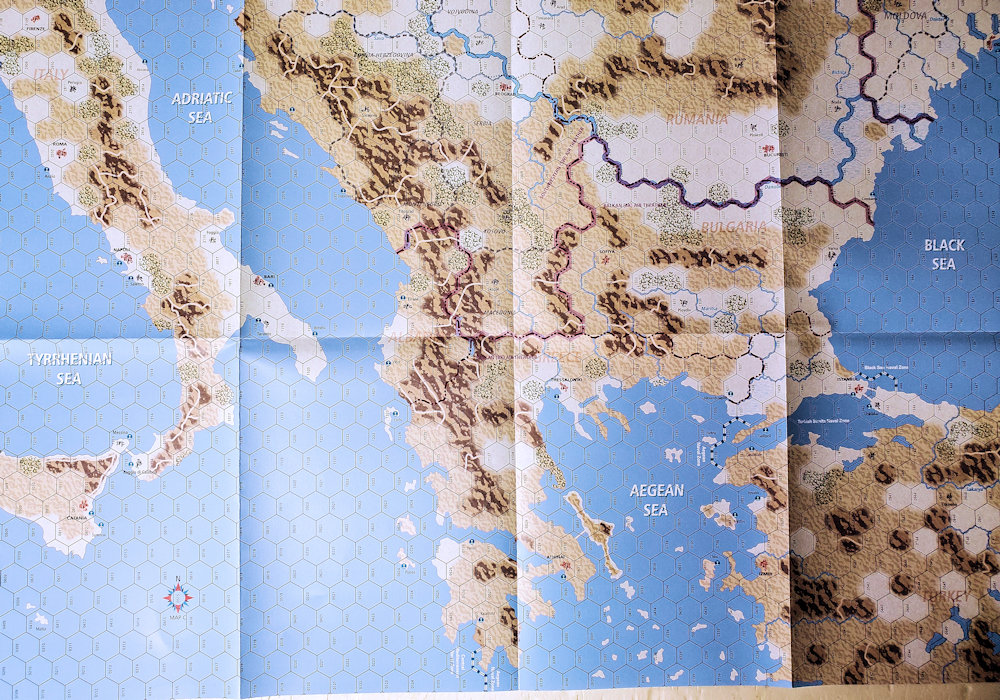 カウンターをみて特徴的なのは、オリジナル版に比べて遥かに綺麗になっていることと、陸上ユニットの裏面がモラル1ダウン状態になっていることです。後者はプレイアビリティ上有難い修正で、特に東側のユニットは1度士気低下すると、完全状態には絶対戻らないというルールがあり。そのため、オリジナル版では、戦いが進むにつれて東側ユニットに士気低下マーカーが乘りまくるというちょっと美しくない光景が現出されました。今回のユニット修正により、最初のモラルダウンでは士気低下マーカーを載せる必要がなくなったので、プレイし易さが改善されました。