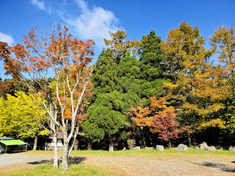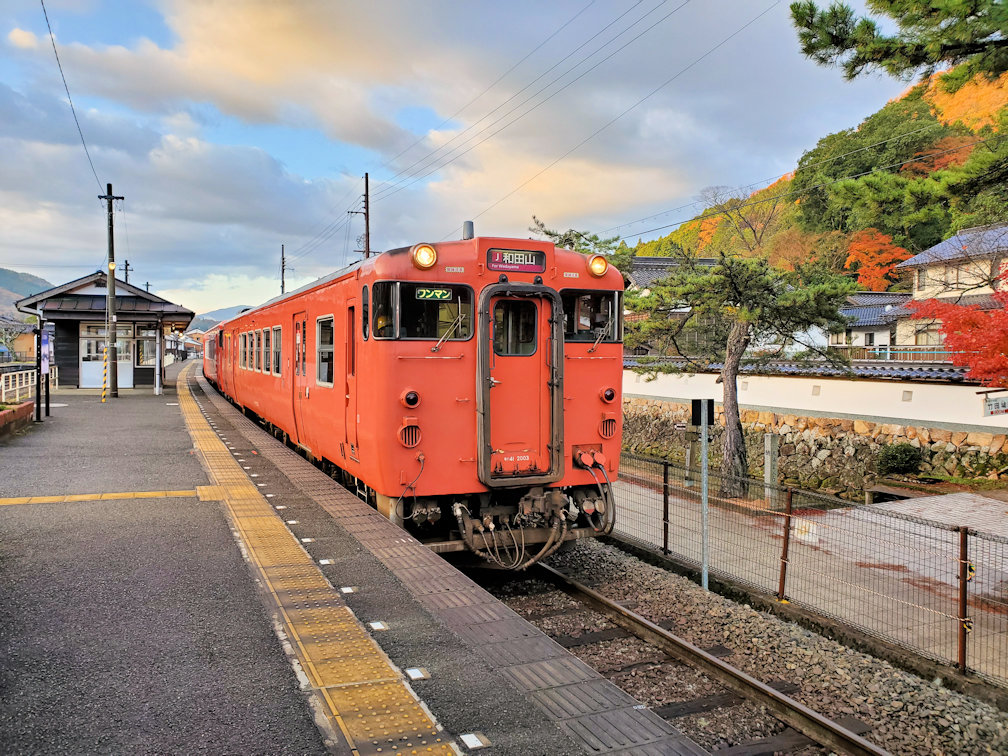 早朝7時過ぎにJR竹田駅に到着。朝寒かったので「歩くの止めようかな」と怠け癖が頭をもたげていたのですが、竹田駅の裏手で綺麗な紅葉が見えていると、俄然、気力が漲ってきました。