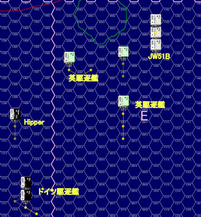 JW51Bの左後方から近づくドイツ重巡「ヒッパー」に対して、JW51Bを直接護衛している2隻の英駆逐艦「オンズロー」「オーウェル」が果敢に挑んだ。距離10,500m(7Hex)から「ヒッパー」に連続射撃を浴びせかける英駆逐艦。2発が相次いで「ヒッパー」に命中。その1発が「ヒッパー」の方位盤基部に命中。一時的に「ヒッパー」は射撃能力を失う。