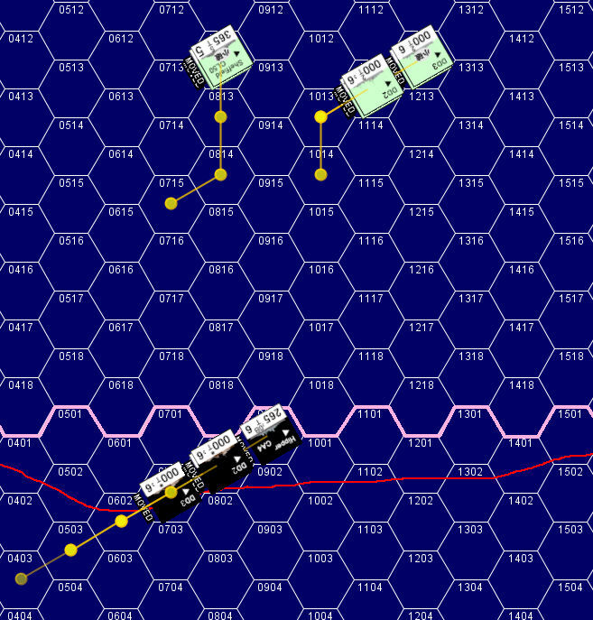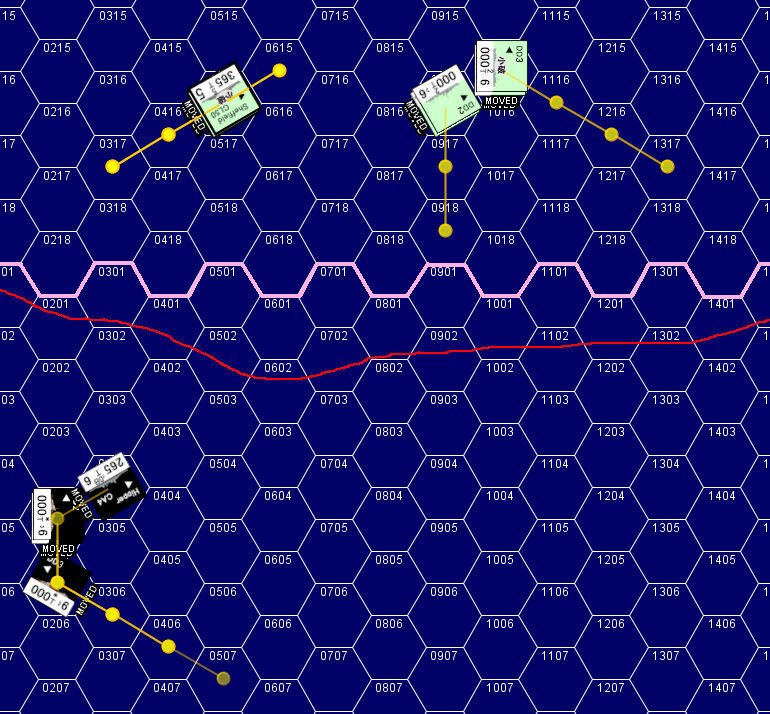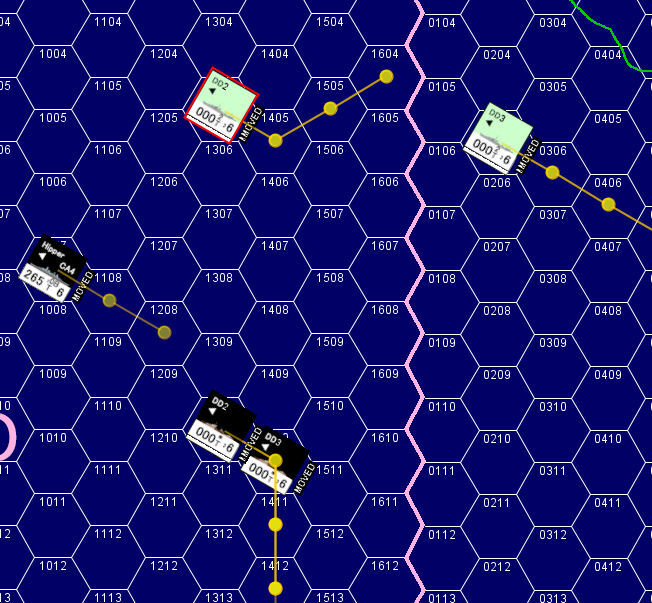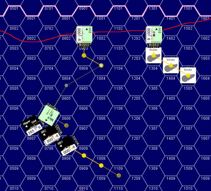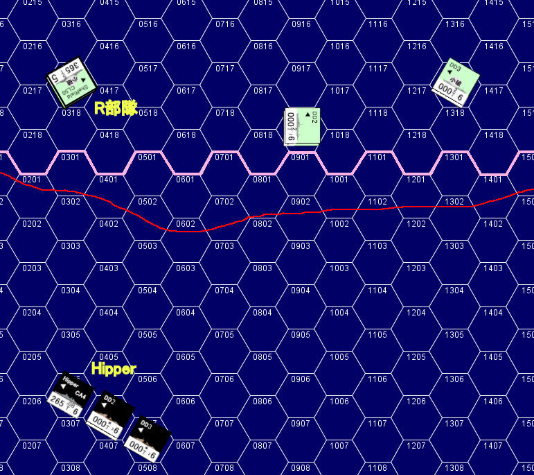 「ヒッパー」がさらに「シェフィールド」に命中弾を与えていた。X砲塔に命中した1発は同砲塔を使用不能にしていた。味方巡洋艦の苦戦を見た英駆逐艦は、ドイツ艦隊の艦首を横切る方向に針路を変更。距離10,500m(7Hex)の距離から魚雷攻撃を仕掛けてドイツ艦隊を牽制する。さらに近づいてくるドイツ艦隊に対して英駆逐艦は魚雷攻撃の第2波を仕掛ける。日本駆逐艦のように「大量の魚雷を一斉に発射」するのではなく、少量の魚雷を逐次投入する戦術だ。兵力的に劣勢下にある英艦隊にとっては、時間稼ぎが最大の戦術になる。