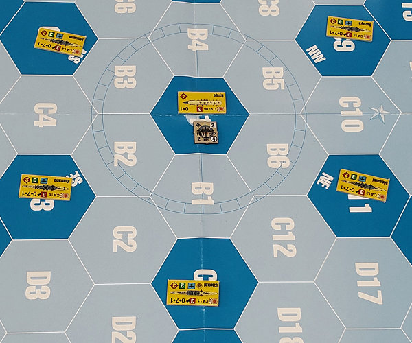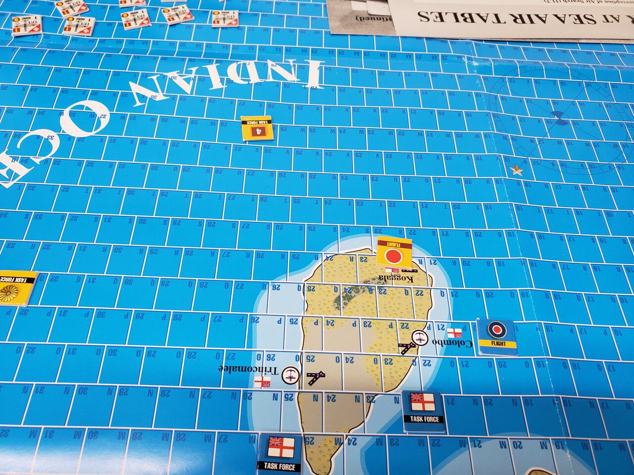 そのセイロン攻撃シナリオだが、圧倒的な破壊力を持つ南雲機動部隊に対し、兵力に劣る英艦隊がまともに挑戦するのは困難だ。うまく奇襲に成功すれば良いが、そうでなければ質量両面で優位に立つ南雲機動部隊の独壇場になる。そもそも足の短い英軍機の場合、敵艦隊を4スクエア(約150海里)以内に捉えない限り、攻撃隊を発進させることすらできないのだ。それに対して南雲機動部隊はその2倍にあたる8スクエアから攻撃が可能だ。普通に戦えば、南雲機動部隊と英機動部隊の直接対決が後者の一方的な敗北に終わることが容易に予想できる。