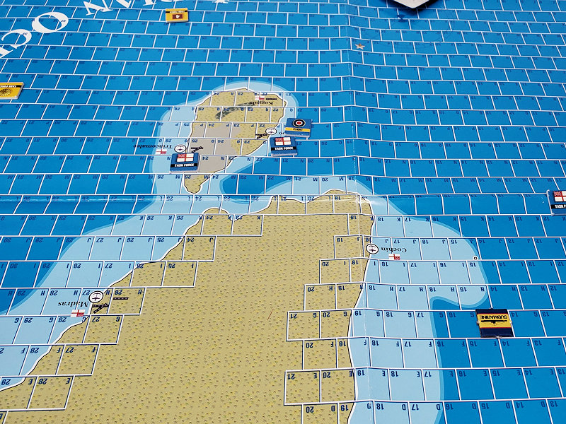 このように基地は頑強なので、英軍としては航空基地を積極的に活用したい。基地の弱点は動けないこと。従って航続距離圏外の敵艦に対しては手出しができない。しかし本作には「裏技」があり、航空機による片道攻撃が認められている。無論、片道攻撃を行った攻撃機は帰ってこないし、道義的にも片道攻撃は「如何なものか」と思ってしまう。しかし敢えて片道攻撃の意思を示すことで相手の動きを掣肘することができると考えれば、「脅し」としての片道攻撃には意味がありそうだ。