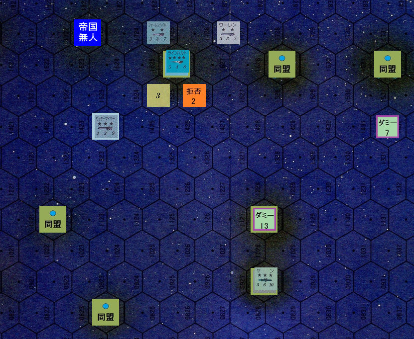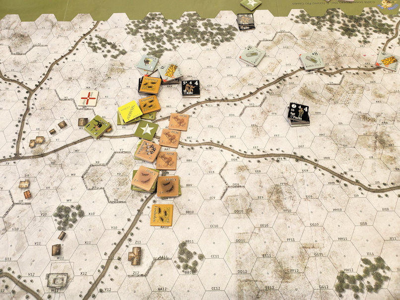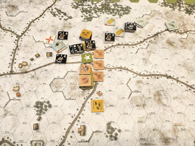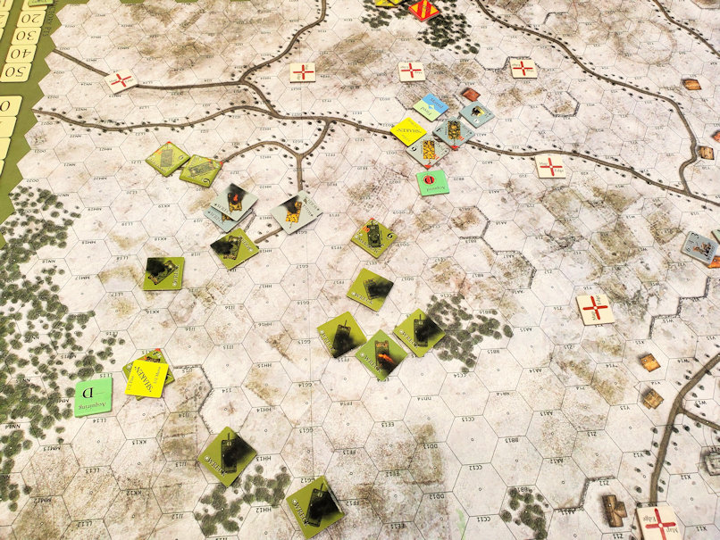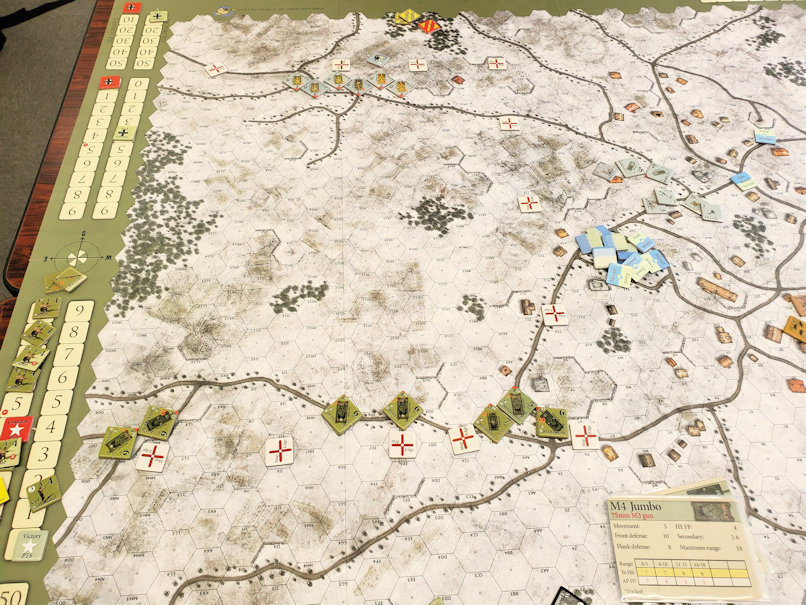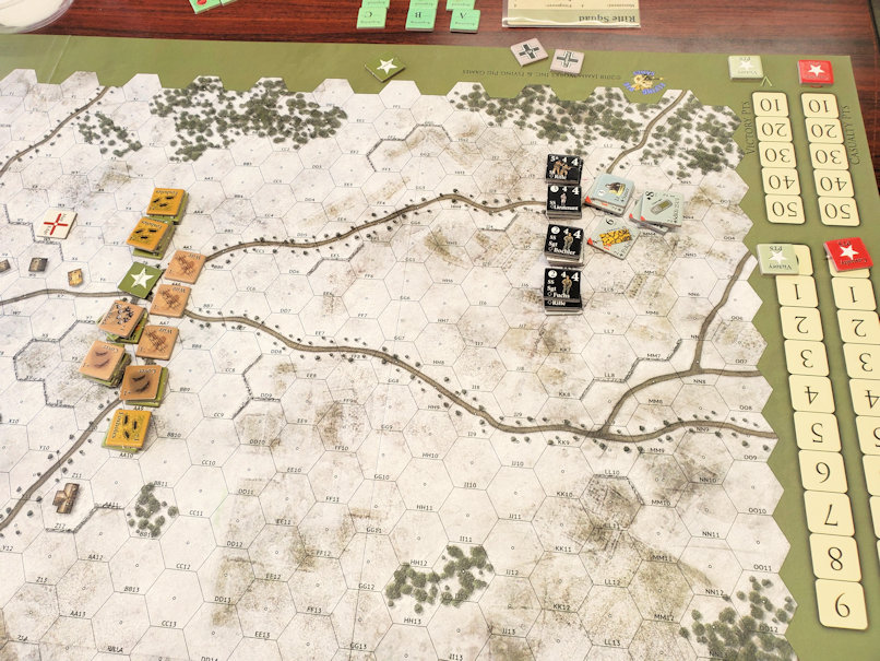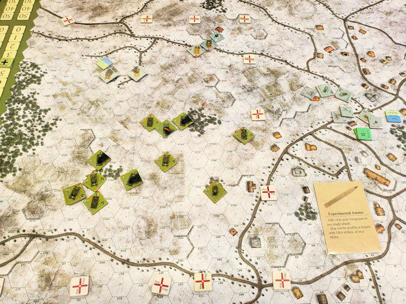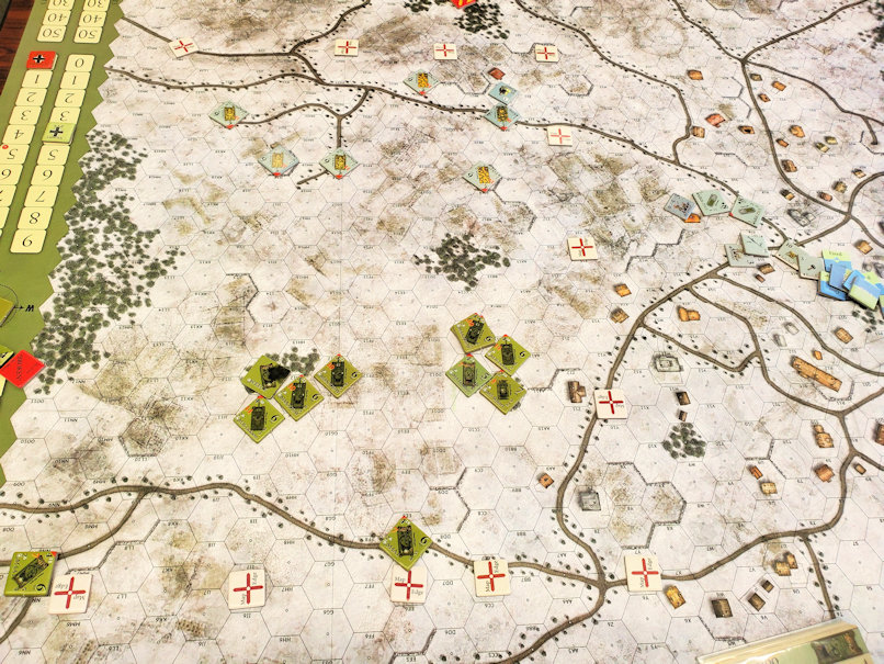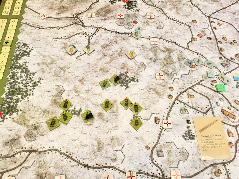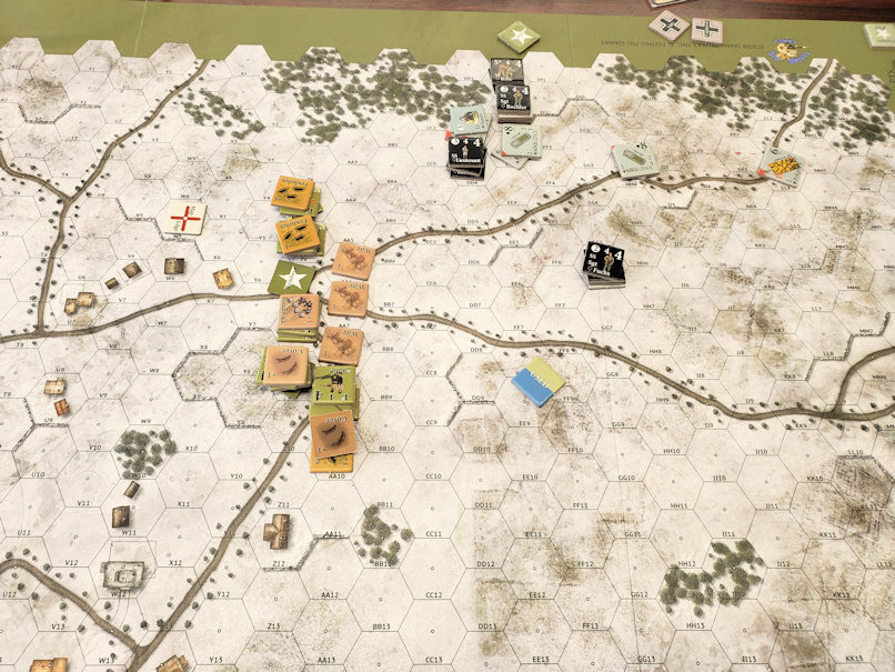 米軍が南北軸に展開しているのを見たドイツ軍は、米軍戦線の翼を付くことにした。このシナリオでは吹雪の影響で視認距離が4Hexに制限されている。そこで「我が全力を以て敵分力を撃つ」の鉄則通り主力を北側から侵入させ、火力集中で敵部隊を1つ1つ制圧しながら前進していく。米守備隊は前進するパンター戦車に対してバズーカ砲で反撃するも、バズーカの威力では重装甲を誇るドイツ戦車には歯が立たない。パンツァーファーストでもあれば良かったのだろうが・・・。