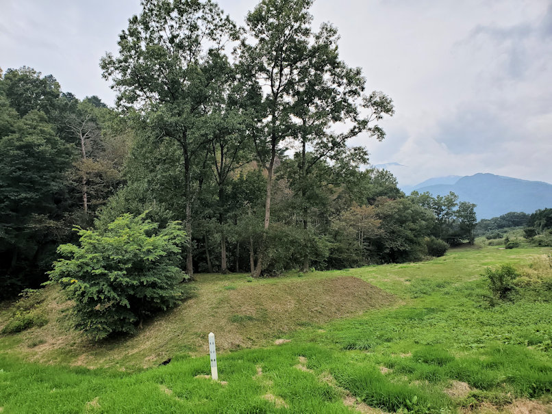 駐車場へ戻ると、新府城の北面が見えています。今では荒れ地や田畑に変わっていますが、土塁や空堀の跡をハッキリと見ることができます。