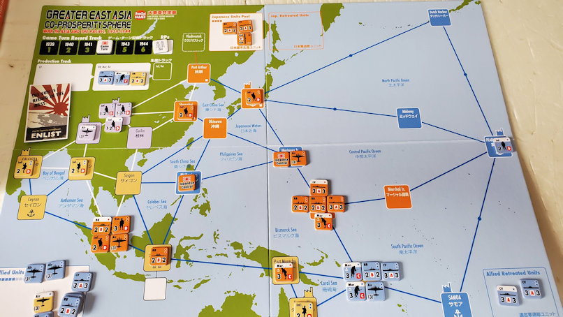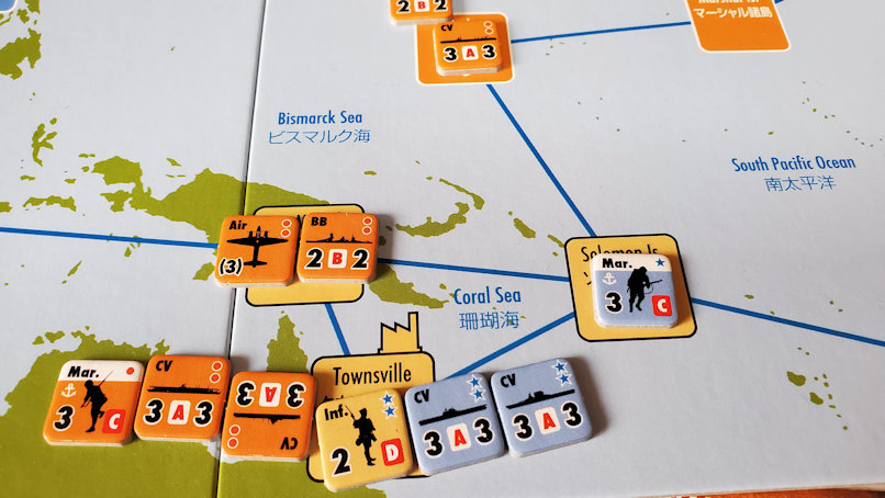日本軍はさらに占領地を広げるべく作戦を行う。シンガポールを基点としてラングーンを目指すビルマ作戦。しかしラングーンを守る英連邦軍の防衛によって作戦は頓挫してしまう。海軍はポートモレスピーを基点としてオーストラリアに侵攻する。しかし米空母2ユニットがリアクションを実行。戦力的には日本軍が有利であったが、出目に恵まれず米空母1ステップに対して日本空母3ステップを失い、まるで史実におけるミッドウェー海戦のような結果になった。