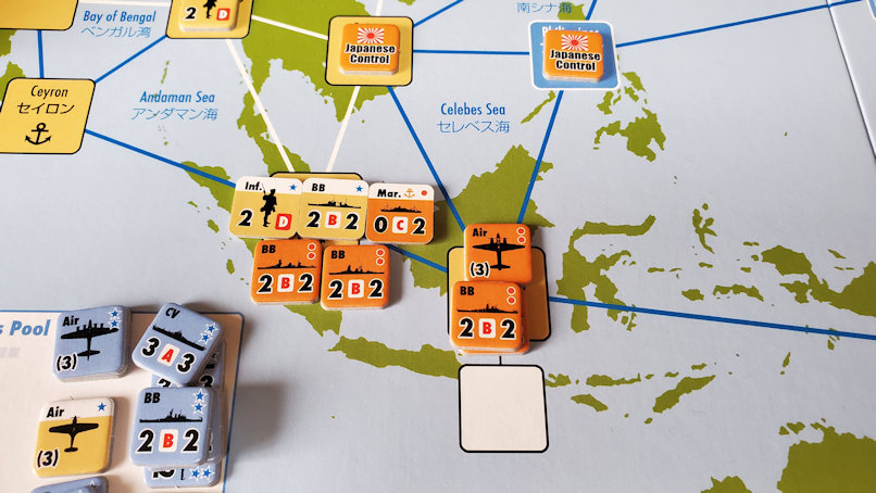 ボルネオ支配によって資源を確保した日本軍。その資源を利用して作戦を継続する。まずはシンガポール攻略。戦艦2ユニットと海軍陸戦隊を以てシンガポールに攻め込んだ日本軍は、シンガポール攻略に成功した。慌てた英連邦は地上部隊を急遽増設し、カルカッタに配備する。