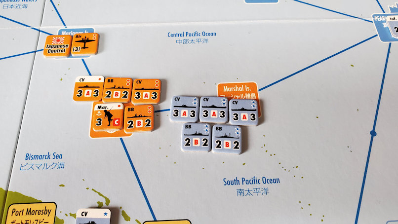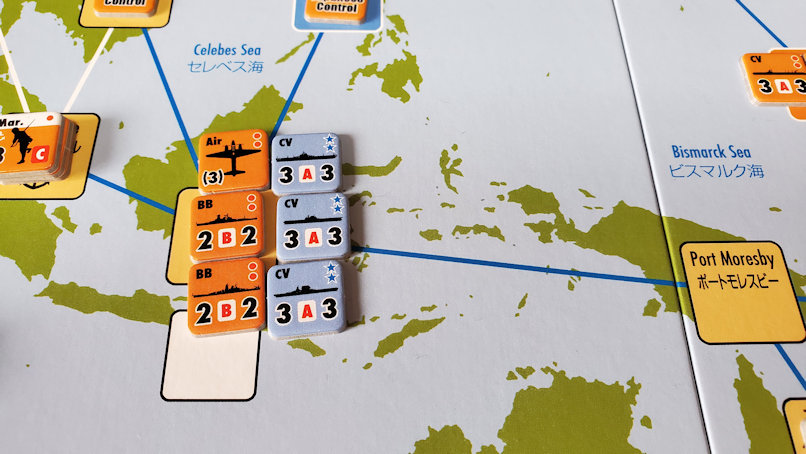 しかし米軍も黙っていない。サモアに集結した空母3ユニットがボルネオに強襲攻撃を仕掛けてきた。出目が良ければ日本戦艦2ユニットを一方的に撃沈出来た所だが、出目は悪く戦艦1ステップロスのみ。逆に戦艦群の反撃によって空母1ユニットが沈んでしまう。