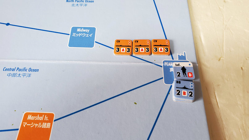 ともかく日本は戦争を開始した。開戦劈頭空母3ユニットよりなる南雲機動部隊は真珠湾に配置された米太平洋艦隊主力を奇襲。戦艦2ユニットを撃破した。さらに水上部隊は南方ボルネオに侵攻し、油田地帯を手中に収める。