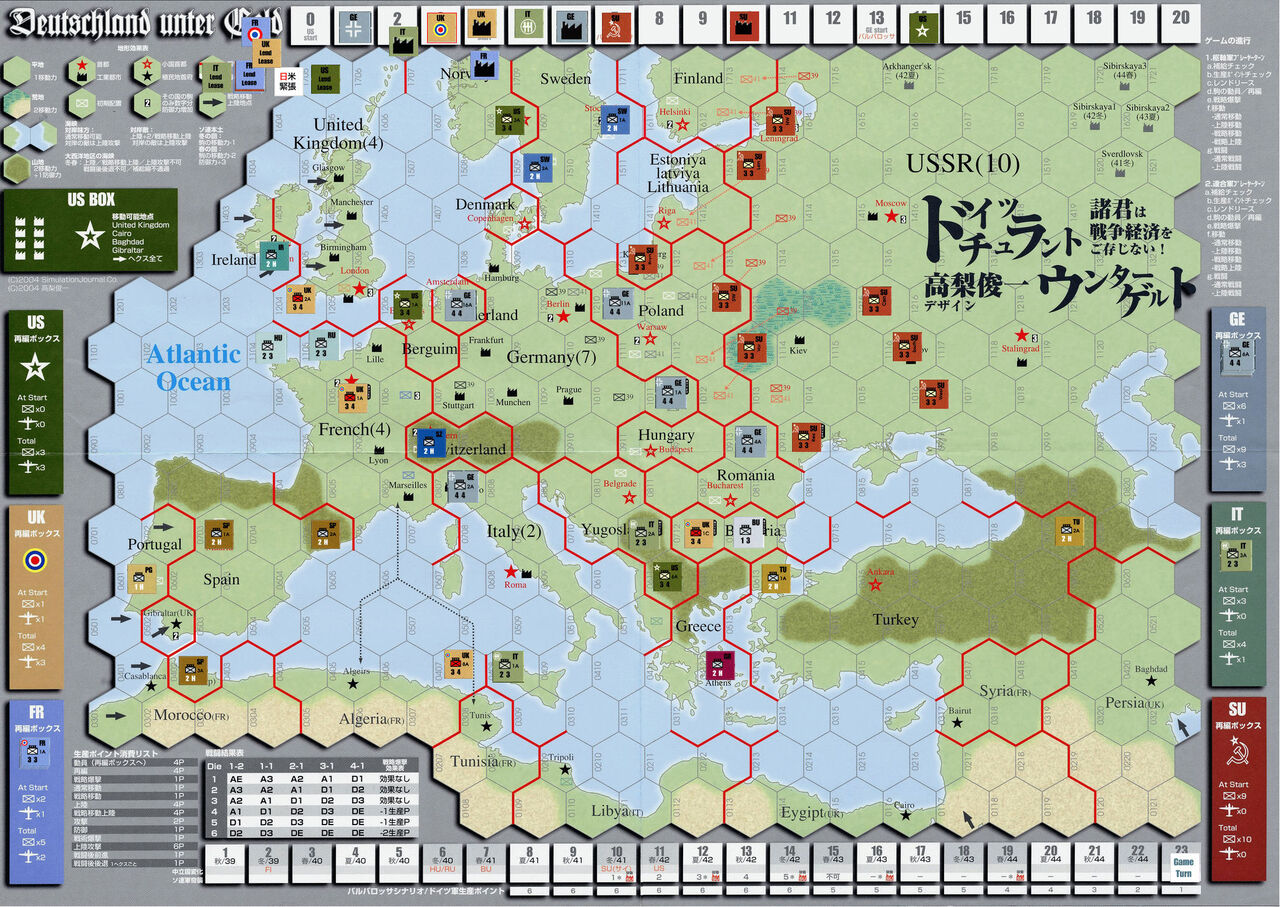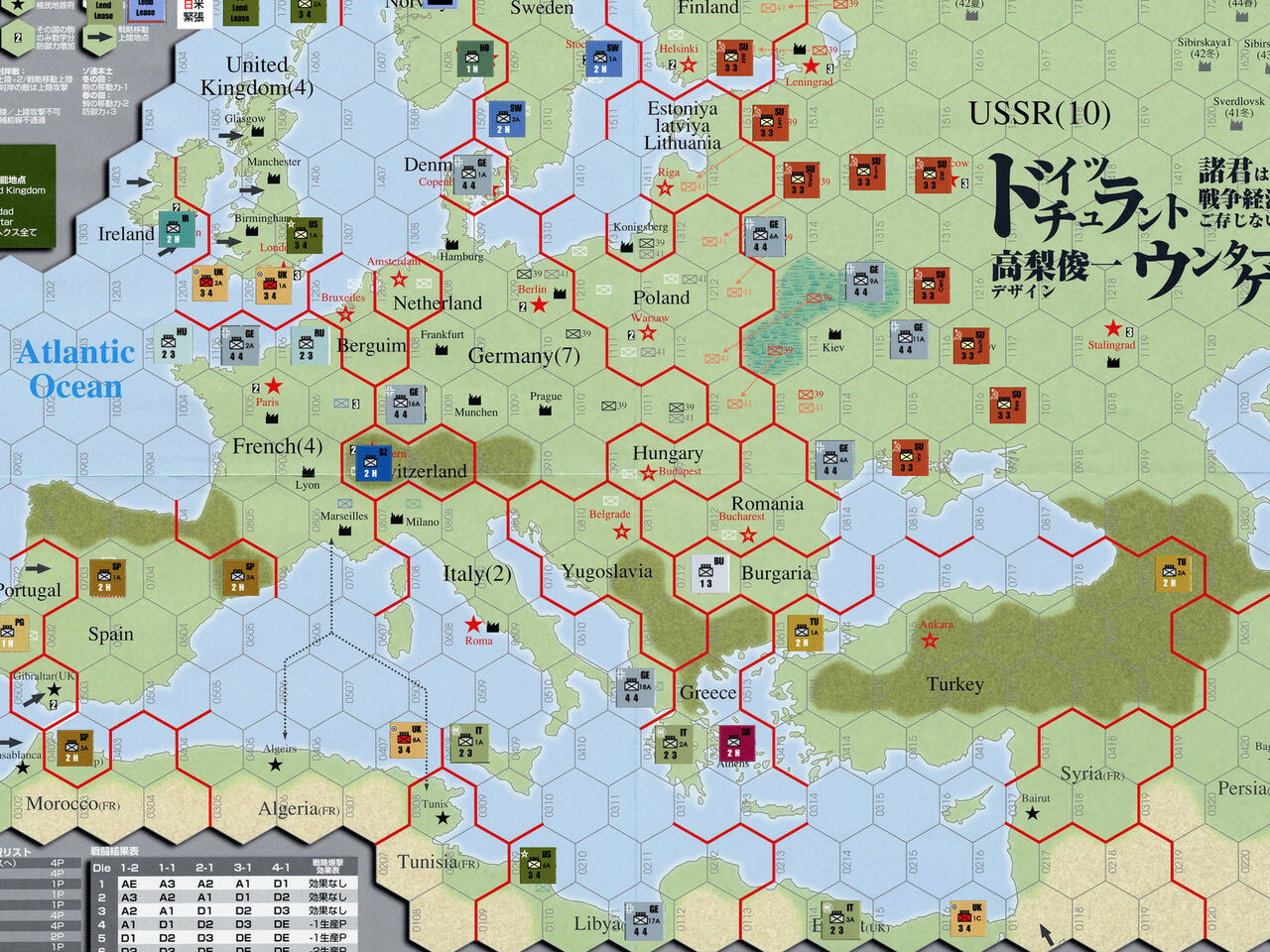 「ドイッチュラント・ウンターゲルト」(以下、本作)は、1983年に旧Tactics誌7号の付録ゲームとして発表された作品である。テーマはWW2の欧州戦線で、1Turnは実際の3ヶ月、1hexは約300km、1ユニットは軍~軍集団に相当する。航空部隊は抽象的に登場するが、海軍部隊はユニット化されていない。