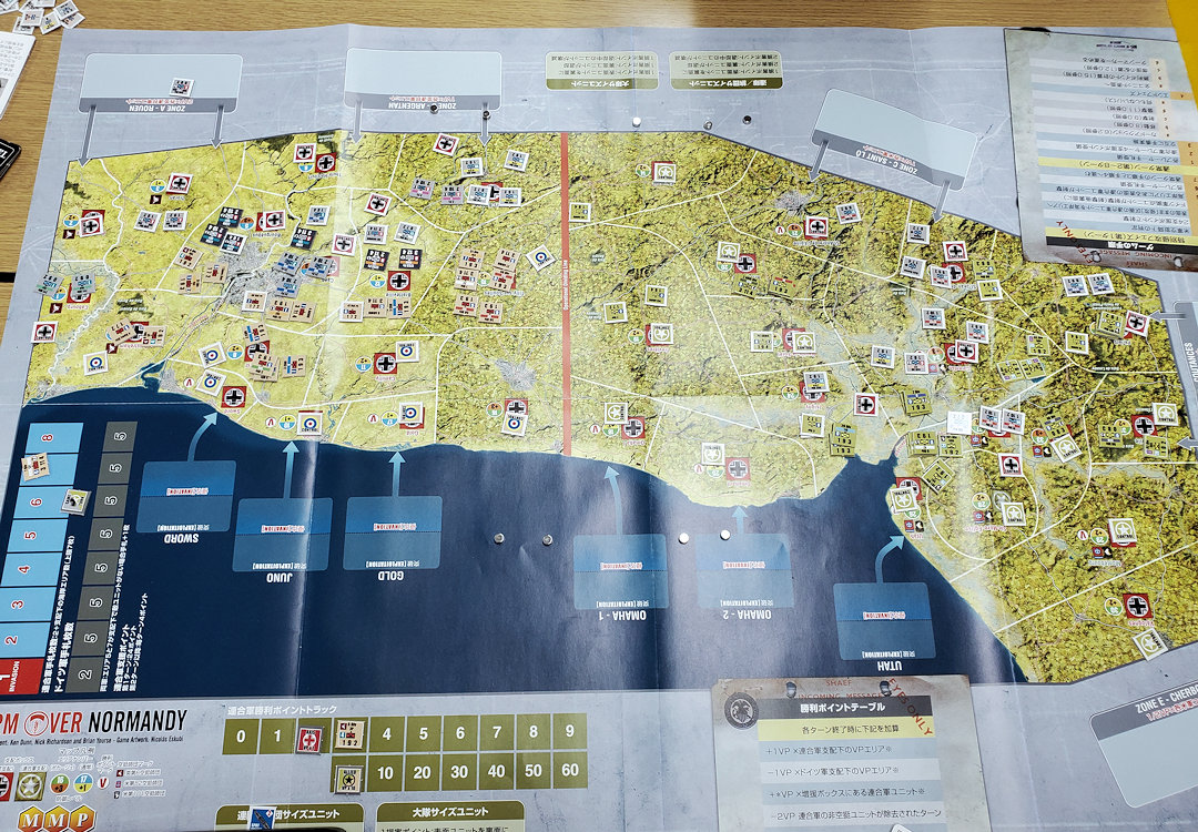 Storm Over Normandy(以下、本作)は、2022年にGame Journal誌83号の付録ゲームとして発売されたシミュレーション・ウォーゲームである。元々は米国MMP社が2015年に発売した作品だ。テーマは1944年6月のノルマンディ上陸作戦で、同作戦の最初の8日間を、1Turn=1日、1ユニット=大隊~連隊・旅団規模で描く。