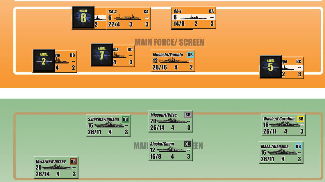 第3ラウンド。ここで漸く水上戦となった。米軍の水上部隊は、新鋭高速戦艦10隻、大型巡洋艦2隻。日本軍は先の戦力から巡洋艦の半数以上と戦艦部隊は3隻損失、2隻大破という状況である。