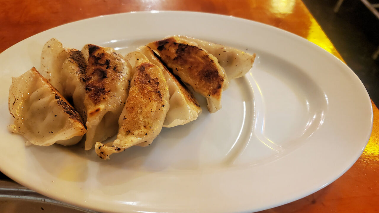 続いて豚肉入り餃子です。焦げ目が香ばしい餃子は、皮はパリッと、中の餡は豚肉の旨味が凝縮されています。スパイシーな風味がアクセントになり、軽やかな辛味が食欲をさらにかき立てる一品です。一つ一つがしっかりと味わえるサイズ感で、肉の旨味と香辛料の絶妙なバランスが楽しめます。