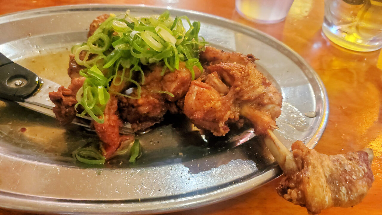 まず骨付き鶏ですが、親鶏と若鶏の選択可能で、今回は柔らかそうな若鶏を選びました。この骨付き鶏は、たっぷりのネギがトッピングされており、そのシャキシャキとした食感と爽やかな風味が、ジューシーで香ばしい若鶏の肉と絶妙にマッチしていました。外側はカリッと焼かれた皮の香ばしさが食欲をそそり、噛むと溢れ出す肉汁がスパイスの効いた下味と絡み合い、口の中で至福のハーモニーを奏でます。焼き目の香ばしさとたっぷりのネギが生むコントラストが、この一皿を特別なものにしています。