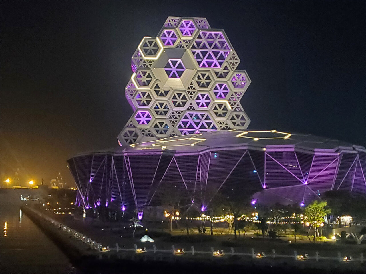 タイトル通り高雄地区のポップミュージックホールです。独特の外観とカラフルなライトアップで有名な場所で、愛河河口付近にあります。真愛埠頭から見た高雄85