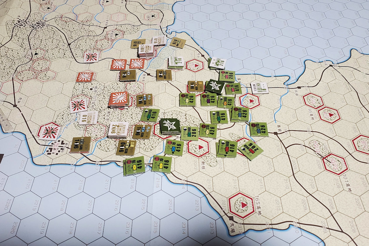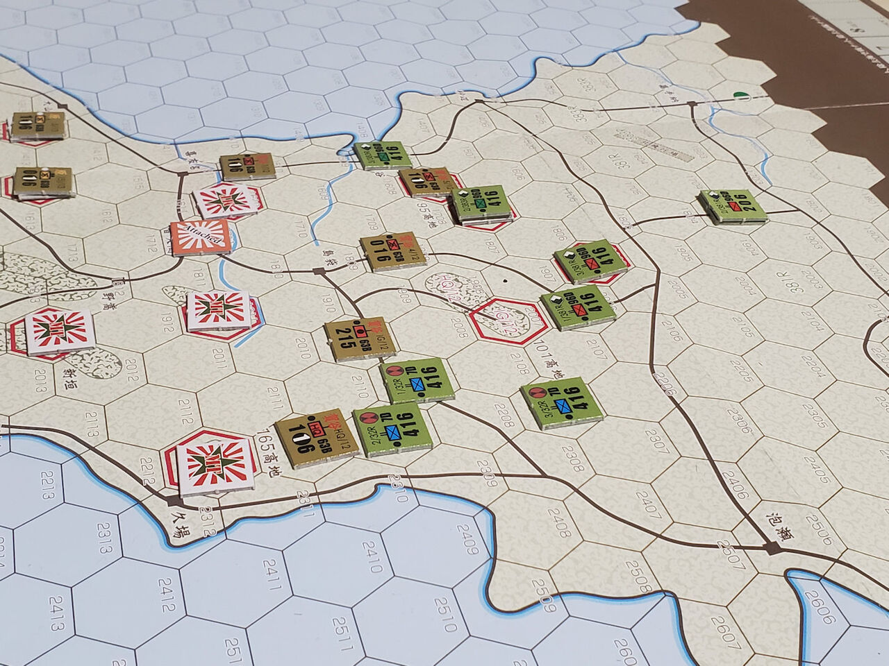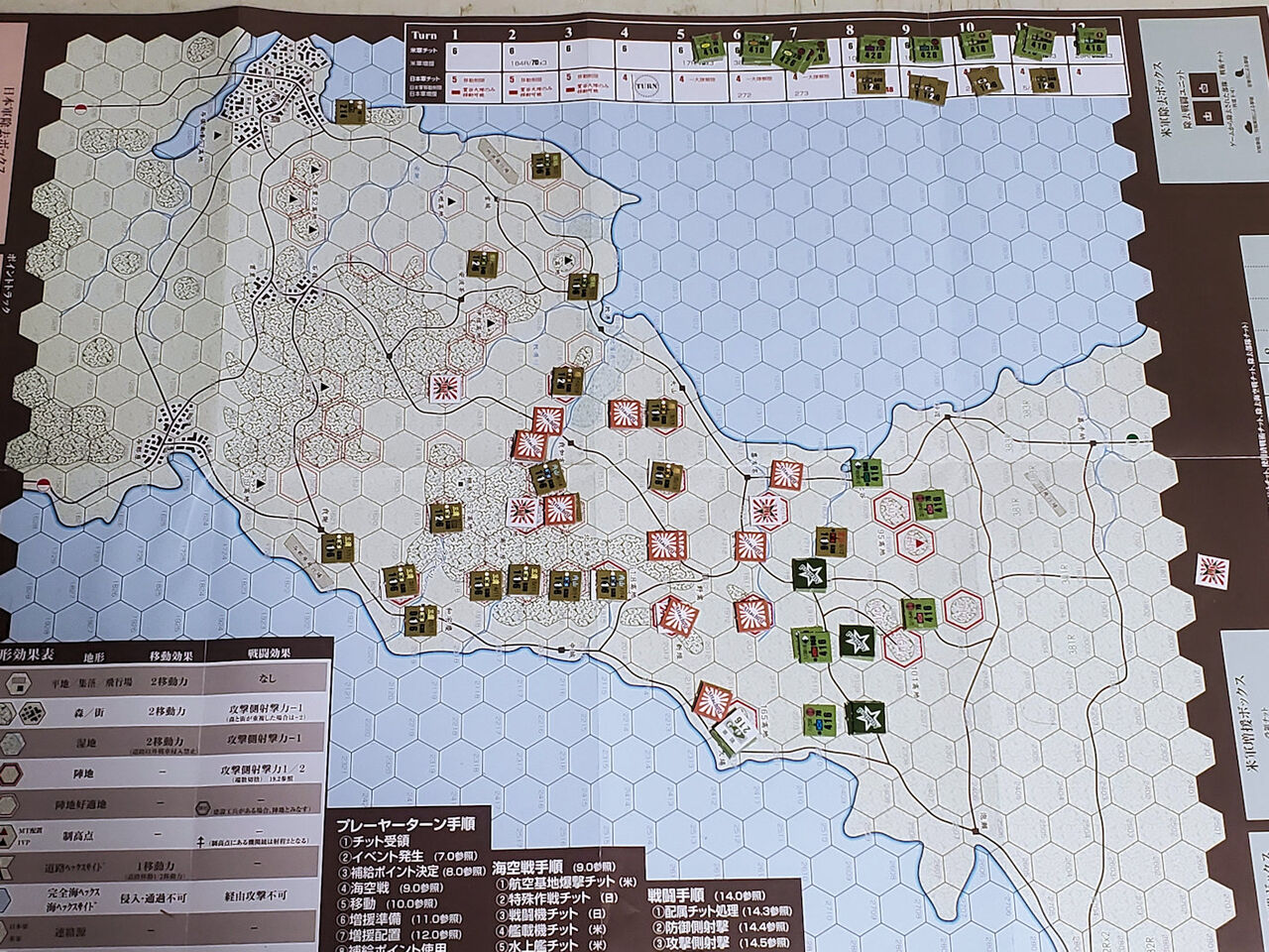 米軍に戦闘爆撃機が登場した。このチットは隣接Hexにいる敵ユニットを2火力で事前攻撃できる。この攻撃が成功すれば突破口が形成できる所だったが、出目悪く攻撃に失敗した。このTurnも米軍はVPチット獲得に失敗し、日本軍は次々とVPチットを獲得していく。