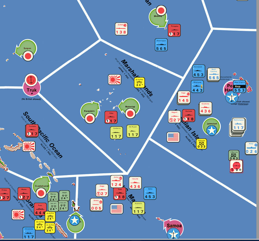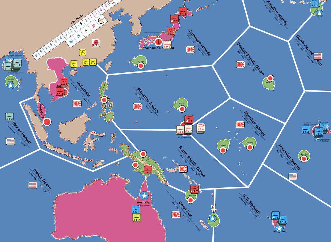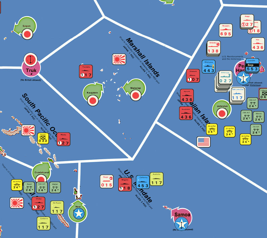 このTurn、日本軍はアリューシャン諸島の制海権を失ったものの、新たに珊瑚海を支配下におき、支配海域は8海域のまま。日本軍は16POCを獲得した。対する連合軍は珊瑚海を失い、今や北太平洋、ハワイ海域、サモア沖、ベンガル湾の4海域のみになった。連合軍は7POCを獲得。日本軍との差は9POCで、累積POCが日本軍の18POCとなった。