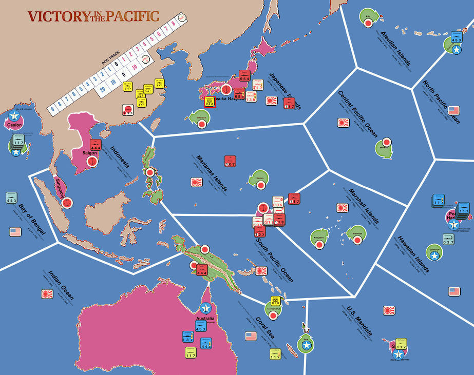 Victory in the Pacific(以下、VITP)は、太平洋戦争をテーマとしたSLGである。ゲームの勝敗はエリア支配によるPOC(制海ポイント)の獲得によって決まる。戦争全体で見れば、終盤に圧倒的な海軍力が登場してくる米軍の勝利は揺るがない。しかしPOCは毎Turn獲得していくシステムになっているので、終盤に米軍が追い上げても、序盤の失点が多いと「戦争に勝ってゲームに負ける」という状況になる。逆に日本軍の勝ちパターンは、序盤POCレースでリードしておき、終盤に貯金を吐き出しつつ何とかギリギリで勝つという形になる。