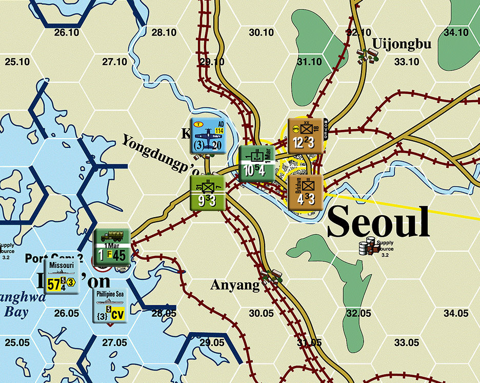 米第1海兵師団の3個連隊が仁川南の平地に無血上陸する。空からは米空母を発進したF-9FパンサーとF-4Uコルセアが空から支援する。余談だが、5年前に太平洋を圧した米空母部隊は、この時期では稼働空母が10隻まで減少していた。その中からこのゲームでは「ヴァレー・フォージ」と「フィリピン・シ―」の2隻が登場する。