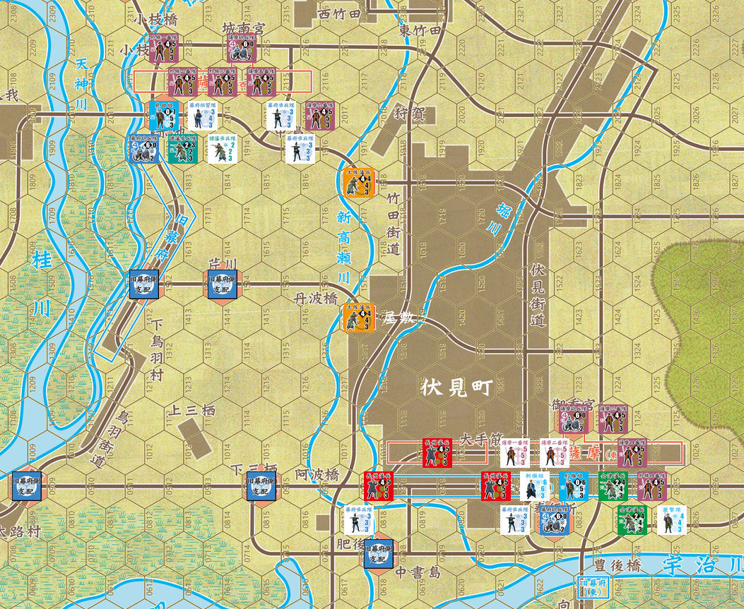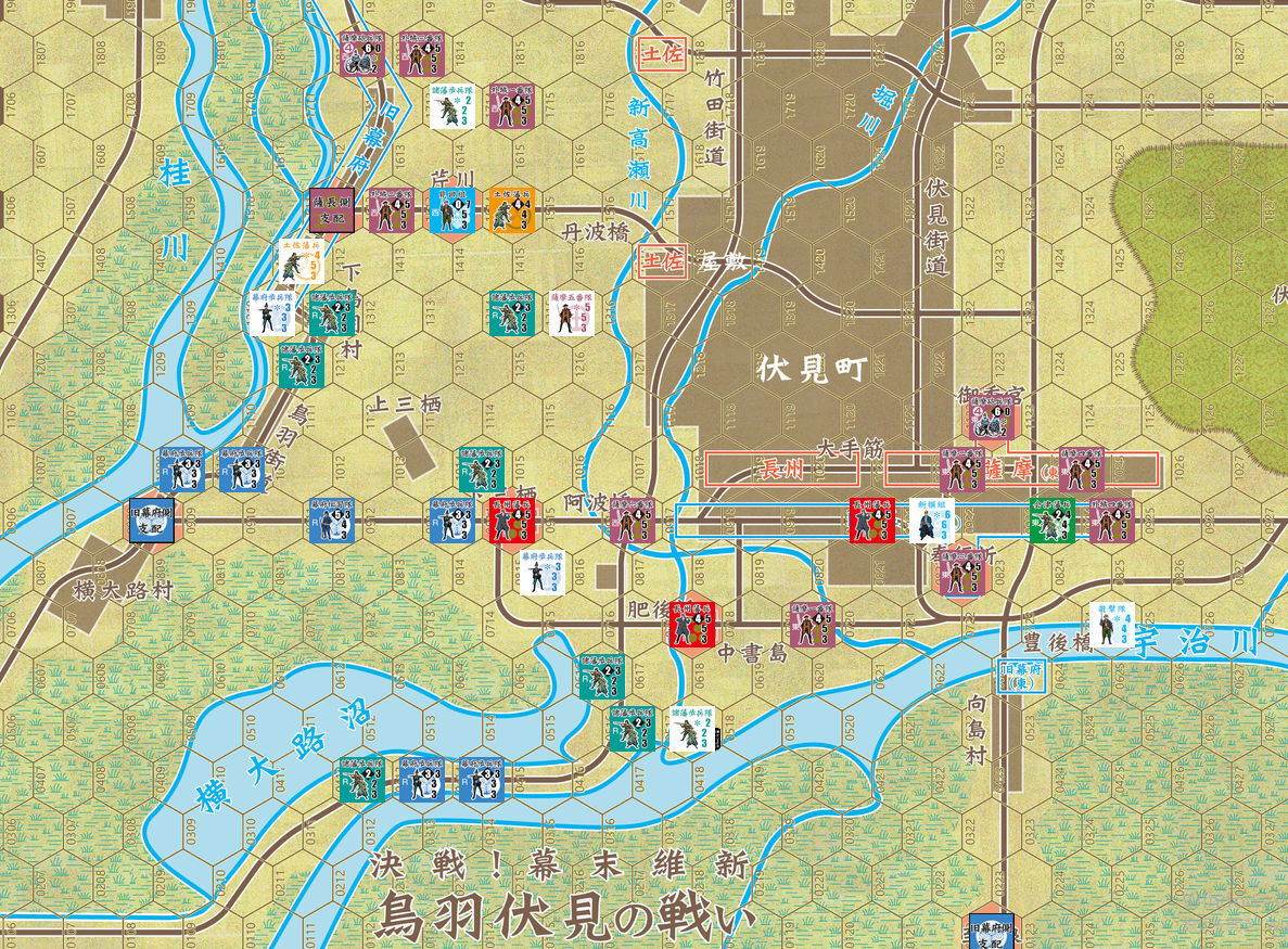 ゲーム開始時点で戦線は鴨河東岸の城南宮方面と宇治川北岸・伏見町南部に分かれている。前者は横に広がる薩摩軍に対して縦に並んだ旧幕府軍が向き合っている状況。後者は両軍が共に横一列に並んで向かい合っている状況である。