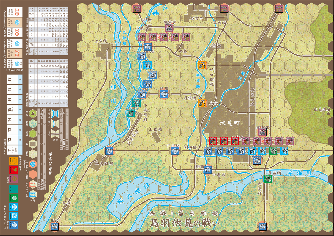 序盤で城南宮方面で幕府軍が攻勢を仕掛けたのは失敗だったかもしれない。それよりは鳥羽街道から芹川、上三栖、下三栖、阿波橋といったラインを守り、伏見方面と連携して戦うのが正解だったようだ。今回は城南宮方面と伏見方面が分断され、それぞれが包囲されてしまったので戦力の有効活用ができなかった。そうなる前に城南宮方面は後退し、伏見方面と連携しながら増援部隊を合わせて守りを固める。そして最終Turnまで逃げ切るというのが正しい戦略であったように思う。ゲームとしての感想だが、ルールはシンプルでわかりやすい。移動や戦闘を行ったユニットにはマーカーを置いて区別するようなシステムになっているが、マーカーを使わなくてもコマ数が少ないので行動実施の有無を記録するのは比較的容易だろう。