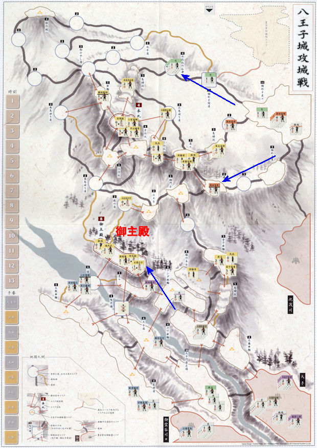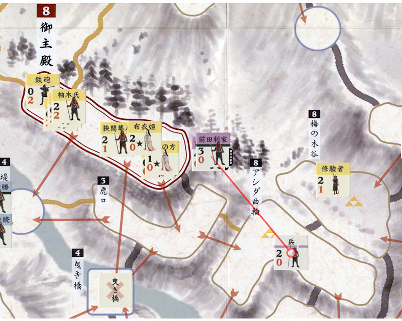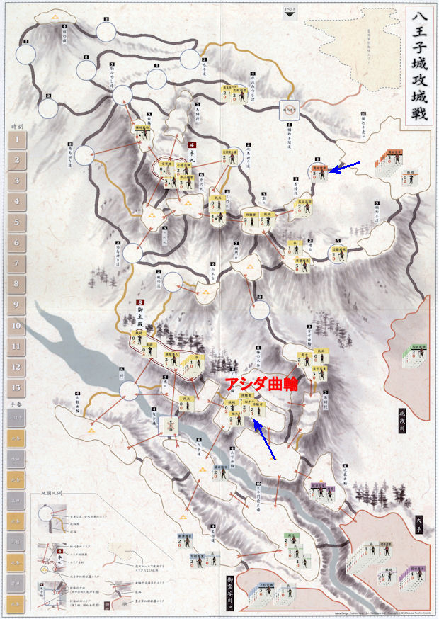 大道寺勢が再び武士1、兵3で山下曲輪に布陣する。待ってましたとばかりに北条勢の猛烈な銃火が降り注ぐ。連続射撃を浴びて大道寺勢は壊滅する。しかしその犠牲は無駄ではなかった。前田勢最強の前田慶次(4-0)、前田利家(3-0)麾下の切り込み隊が、大道寺勢の屍を超越してアシダ曲輪に突進する。アシダ曲輪で凄まじい白兵戦が繰り広げられたが、前田勢は遂に抗しきれず退却。前田勢がアシダ曲輪を占拠した。北方では真田昌幸(3-0)麾下の切り込み隊が前進し、北条方の近藤助実(2-0)を切り伏せた。