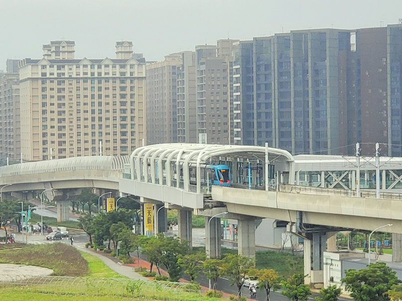 これはMRTではなく、LRT(ライトレール)です。MRT淡水線(RedLine)の紅樹林駅から乗り換えて、Kanidng駅までの7.3km11駅の路線です。ライトレールということですが、前半部分は専用の高架線を走るので、かなりの高速でかっ飛ばします。左右には淡水河東岸地区に広がる高層住宅地が見えています。恐らく台北地区へのベッドタウンなのでしょう。