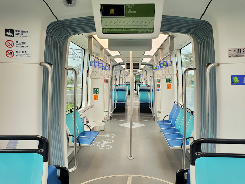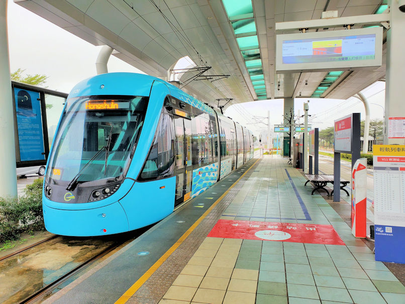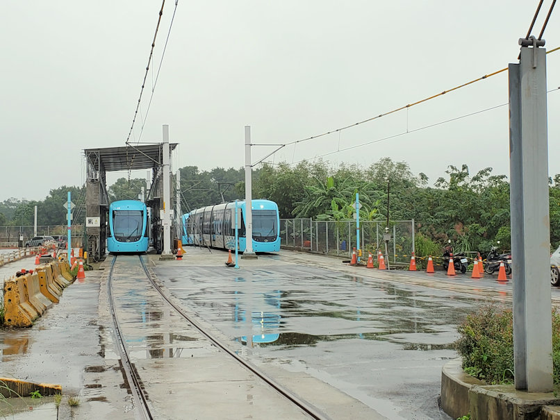 途中の淡水行政中心駅から先は地表レベルになり、道路の真ん中を走ります。日本の路面電車と同じですが、道路部分と路線部分の間に仕切りとなるブロックがあり、一般車両が路線に入ってこれないようになっています。