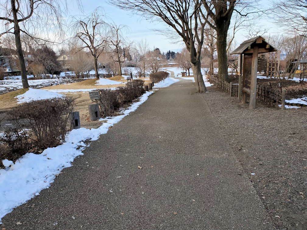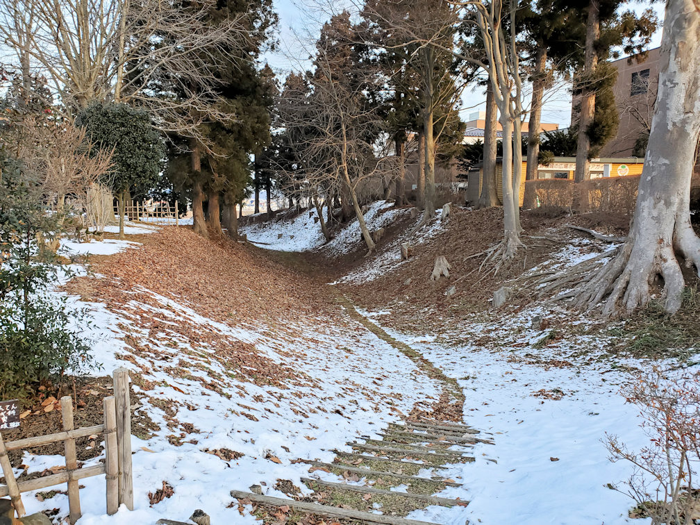 とまあそんな感じで根城にやってきた。八戸の中心街からはバスで数分。街の外れに根城趾がある。すぐそばに馬淵川が流れていて、北から西側は川を防御ラインとし、その他の周辺には空堀を設けている。空堀はかなり深く、攻め込むのは容易ではなさそう。しかし堀が1線しかなく、一度突破されたら、その後は脆いかもしれない。まあ戦国期の城ではないので、仕方がない所か。