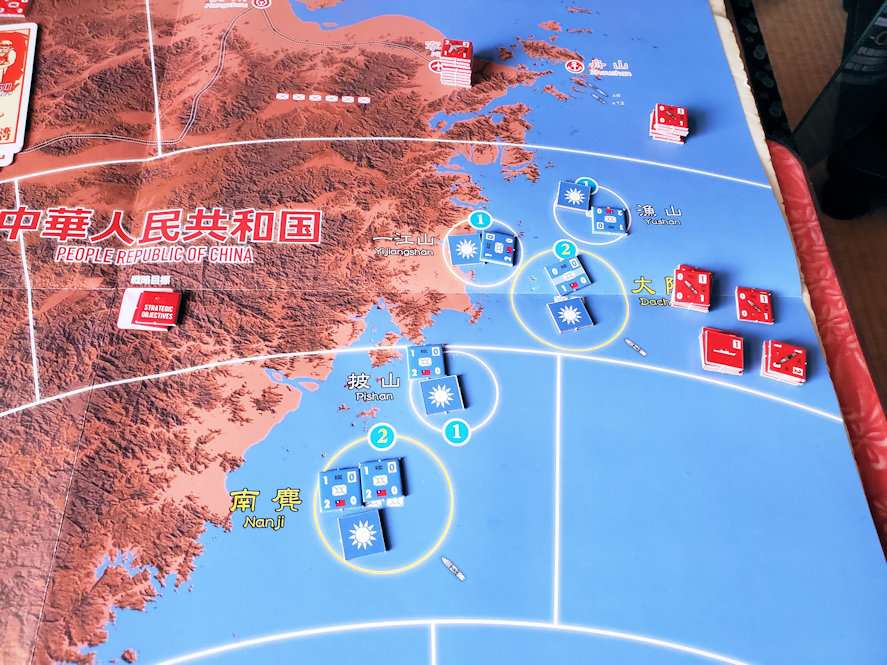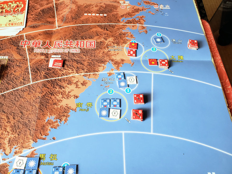 共産軍は大陳(島)に対して上陸作戦を敢行する。兵力で優る共産軍であったが、生き残っていた国府軍の守備隊は善戦した。自らは1ステップを失いながらも共産軍の1ユニットを撃破し、島を守り切ったのである。国府軍は強化した水上部隊を馬租(島)近海に集結させる一方、馬租(島)と金門(島)で陣地構築を行い、防備を固める。