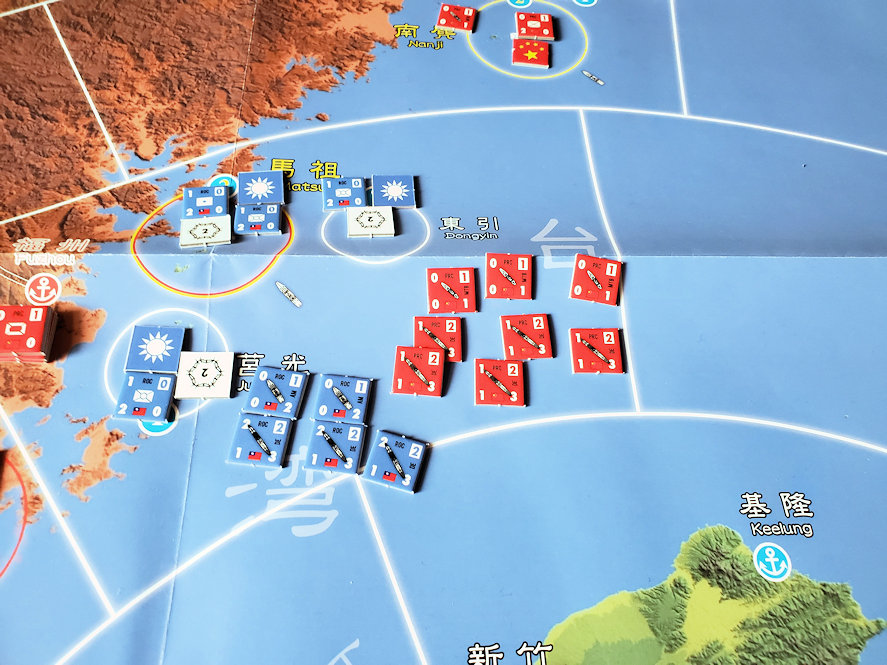 後半戦である。共産軍は南麑(島)に対して上陸を敢行。既に守備隊は全滅していたので共産軍は同島を無血占領した。これにより共産軍のVPは8VPに達し、あと2VPで勝利である。国府軍は「轟雷計画」で配備された重砲部隊を披山(島)に配置し、守りを固める。さらに共産軍を牽制するため、馬租付近の水上部隊を金門付近まで南下させた。そして駆逐艦による艦砲射撃を共産軍が占領する南日(島)に対して実施する。慌てて共産軍は南日(島)に陣地を構築し、艦砲射撃から身を守る形をとる。