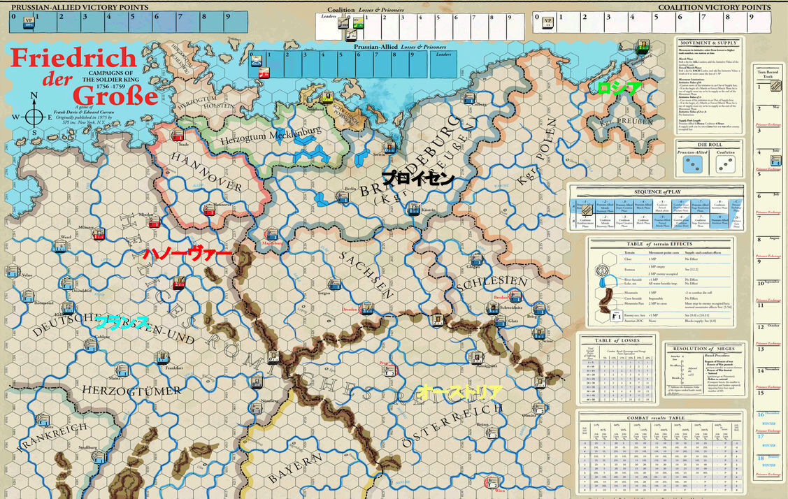 元々このシナリオはフリードリヒにとって一番不利な時期を扱ったシナリオなので、反プロイセン軍が大きなミスをしない限りプロイセン軍が不利なのは否めない。今回は第1Turnにこちらがミスを犯したが、出目に助けられて致命傷にならなかった。もしここで逆の結果になっていれば、今回とは全く違った結果になったかもしれない。VASSALによる通信対戦そのものはスムーズに対戦できた。またチャットだけではなくSkypeを使った会話を混ぜることができたので、意思疎通がスムーズにできたのが良かった。家庭環境その他でSkypeを使うのが難しいケースもあるとは思うが、そうでないのであればVASSL対戦でのSkype(又はその他Web会議システム)の利用は必須に近いと思われる。