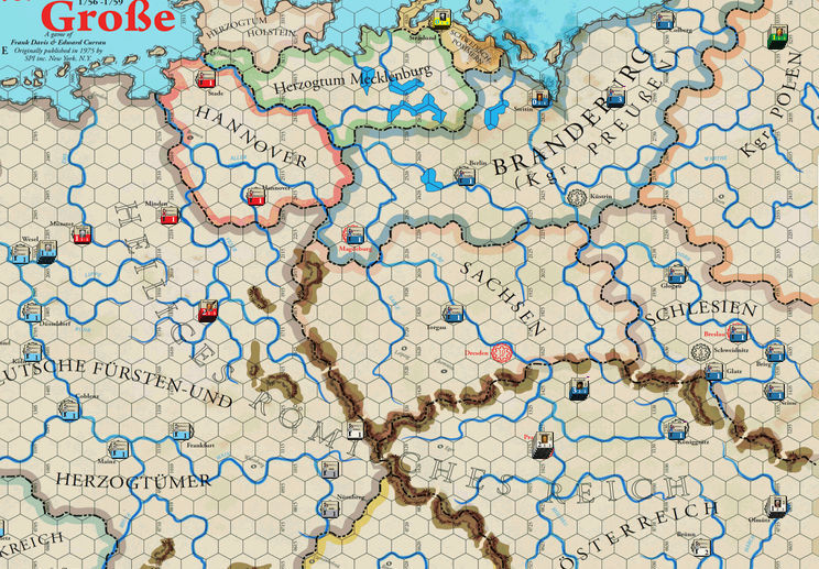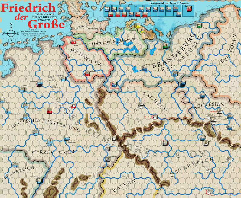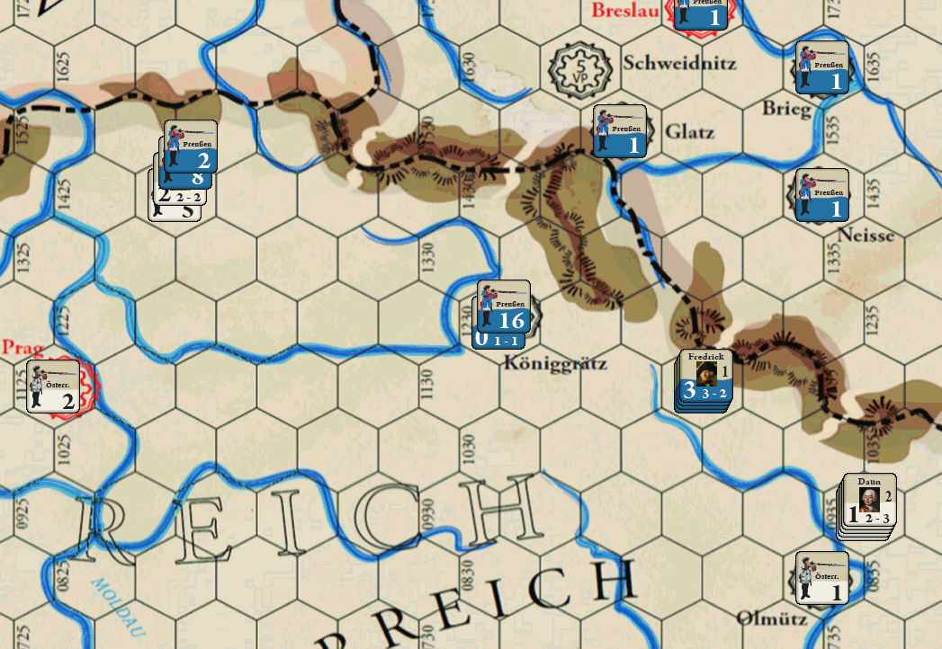 シレジア方面からボヘミア方面に出撃したフリードリヒ(Frederick 3-3-2、指揮能力-攻撃修正-防御修正)は、ケーニヒグレーツ(Koniggratz 1230)を襲う。同地を守るオーストリア軍ダウン(Daun 1-2-3)はフリードリヒとの決戦を回避して南方へ逃れる。別の場所では、プロイセン軍ハインリヒ(Heinrich 2-1-2)は、強行軍によりオーストリア軍ラウドン(Laudon 2-2-2)麾下のオーストリア軍を捕捉、決戦を強いた。兵力では勝るプロイセン軍であったが、出目に恵まれずオーストリア軍を撃破できず。あまつさえハインリヒ将軍が流れ弾に当たって戦死するという悲劇に見舞われた。