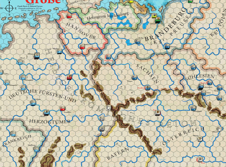 西部戦線ではプロイセンと共同行動を取るハノーヴァー軍がライン方面へ進攻を開始。ブラウンシュヴァイク(Brunswick 1-1-1)麾下のハノーヴァー軍がフランクフルト(Frankfurt 1210)を強襲。一撃でこれを陥落させていた。一方大兵力を誇るフランス軍は、コンダード(Contades 1-1-1)将軍麾下の27戦力がミュンスター(Munster 2206)を包囲。強襲攻撃を実施したが、ハノーヴァー軍シュポルケン(Sporcken 1-1-1)将軍は6倍以上のフランス軍の攻撃に耐えて町を守り切った。