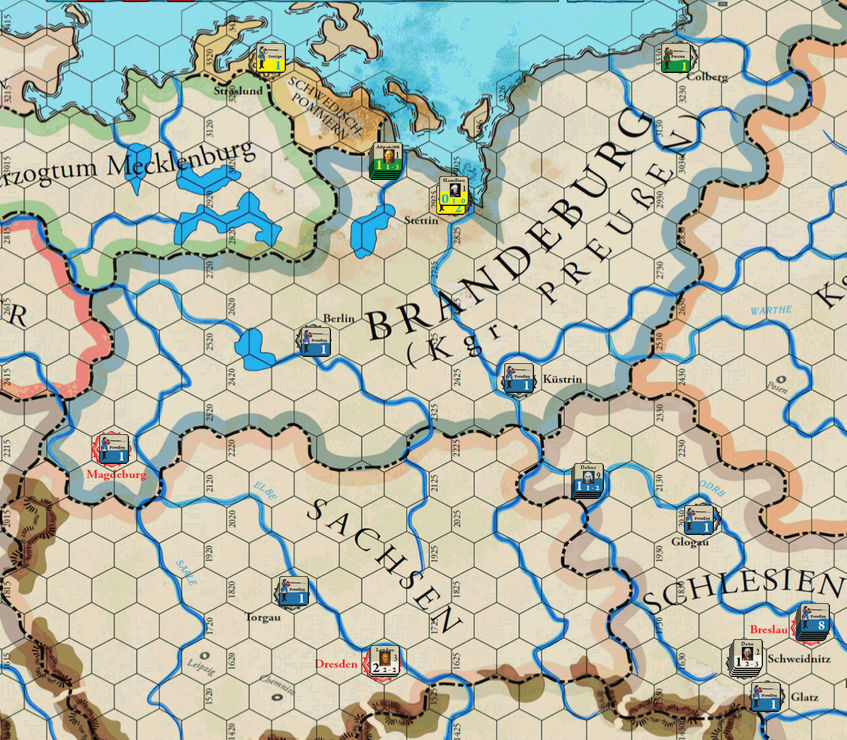 フリードリヒはロシア軍を撃破すべく北に向けて転進する。それを見たロシア軍は一時的にベルリン(Berlin 2522)を狙う姿勢を見せていたが、それ以上は前進できない。8Turn(8月)