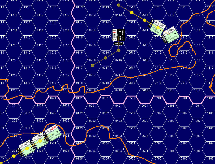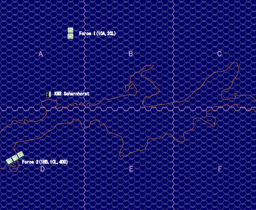 英巡洋艦3隻に追われるドイツ戦艦「シャルンホルスト」は、南南西から接近する新たな艦影を捉えた。それは英戦艦「デューク・オブ・ヨーク」を主力とする戦艦1、軽巡1、駆逐艦4からなるブルース・フレーザー大将麾下のフォース2である。最大戦速で距離を詰めた「デューク・オブ・ヨーク」は距離12,000m(8Hex)で「シャルンホルスト」に対して初弾を発砲した。艦首6門の36cm砲から放たれた主砲弾は、「シャルンホルスト」の後方で水柱を上げた。2Turn