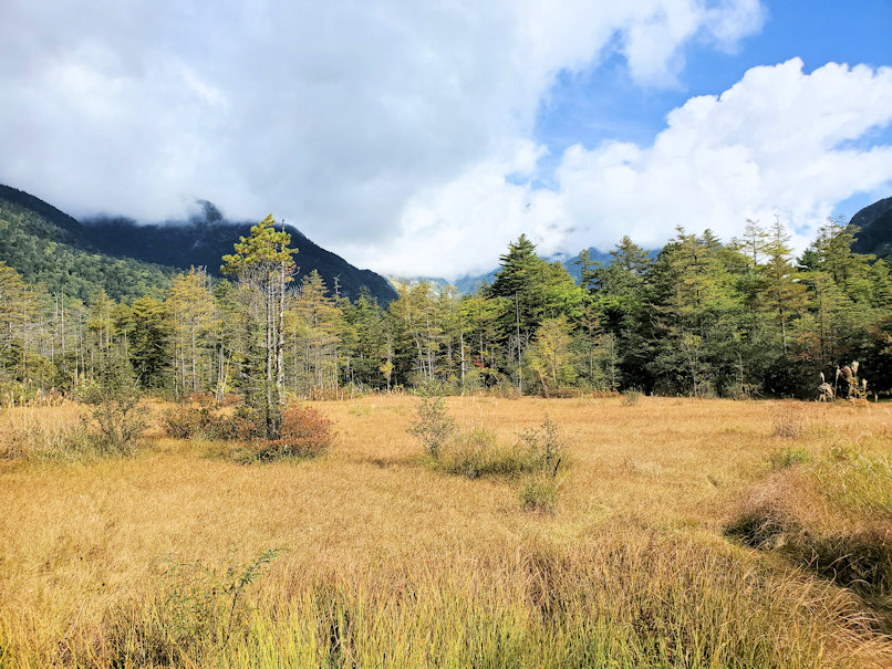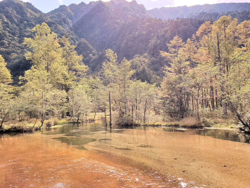 大正池から上高地の中心地である河童橋までは徒歩で約1時間。軽めのトレッキングとしては丁度良い感じです。この一帯は未だに紅葉の気配はあまりありません。ちなみに下の写真の2枚目は、景勝地として有名な田代池です。
