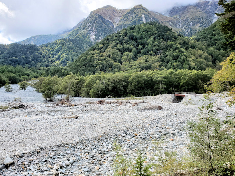徳沢から横尾までが最後のルートになります。この区間が距離3.9kmあって一番長い。相変わらず左手には梓川が流れていますが、その向こうに穂高の山々が見えてきます。