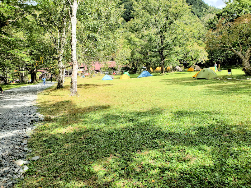 次の中継地点は徳沢。ここは広いキャンプ地といくつかの山小屋があります。ここからも左右に登山路が伸びていて、左へ進むと涸沢に至る通称パノラマロード、右に進むと長塀山から蝶ヶ岳、さらに北に進むと常念岳から燕岳へつながる表銀座ルートにもつながっています。