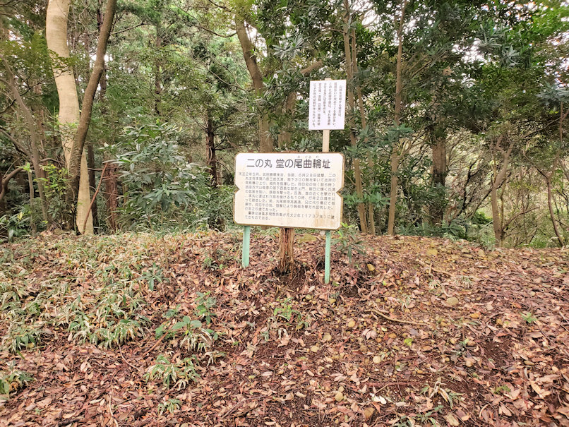 西の丸は高天神社の右の裾野にあり、高天神城の攻防戦で最も激しい戦いが行われた所。先に高天神城は急峻な山城と書いたが、この西正面だけが比較的緩やかな斜面になっており、そのために寄せ手が最初に攻めてくるのがこの西斜面であった。そのため西斜面には重要拠点である西の丸があり、それを守るために土塁や空堀がいくつも築かれていたという。