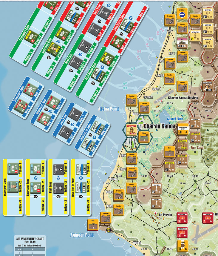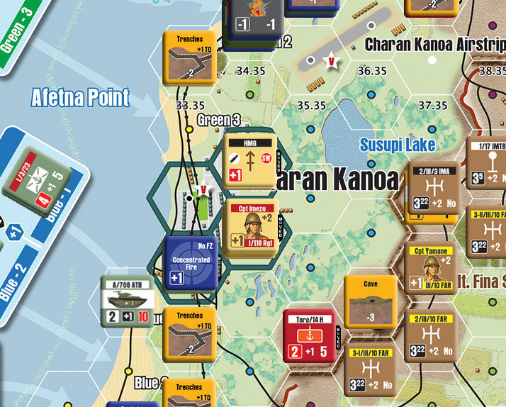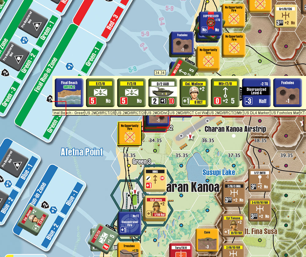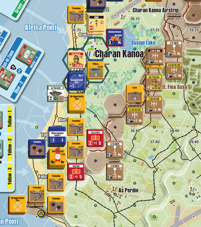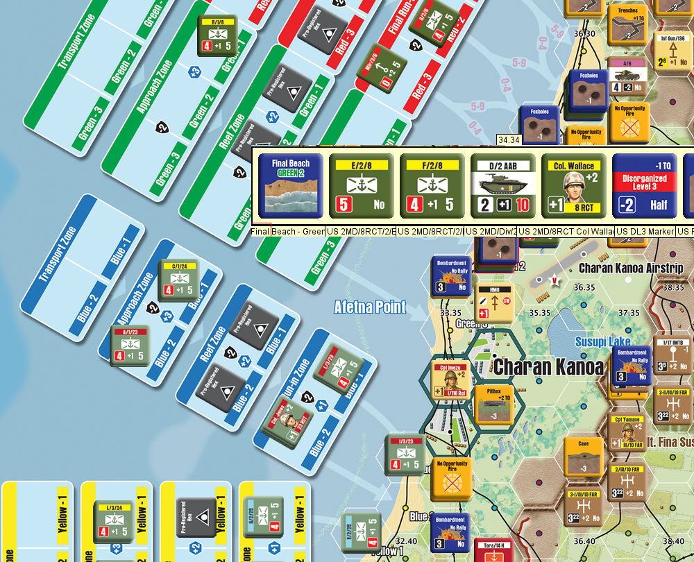 米軍の上陸を迎えて水際撃滅の念に燃える我が第43師団が反撃に出る。しかし先鋒で上陸に成功した海兵隊が散開して橋頭保を固める。水際で反撃する日本軍の猛烈な射撃にも臆することなく上陸を続けていく。チャランカノア飛行場前面では指揮官、水陸両用戦車を含む3ユニットスタック(1個大隊相当)が"0"の目を出して壊滅する所(既に"Supressed"状態だったので、"Supressed"が重なると壊滅する)所であったが、「バーボン」を使用して振り直し要求で辛くも壊滅を免れた海兵隊なのであった。このTurnに除去した海兵隊は、歩兵2個中隊と水陸両用戦車1個中隊である。米第4海兵師団の先鋒がチャランカノア市街地に突入した。やばい。同市には第43師団の司令部がある。このままでは潰されてしまう・・・。