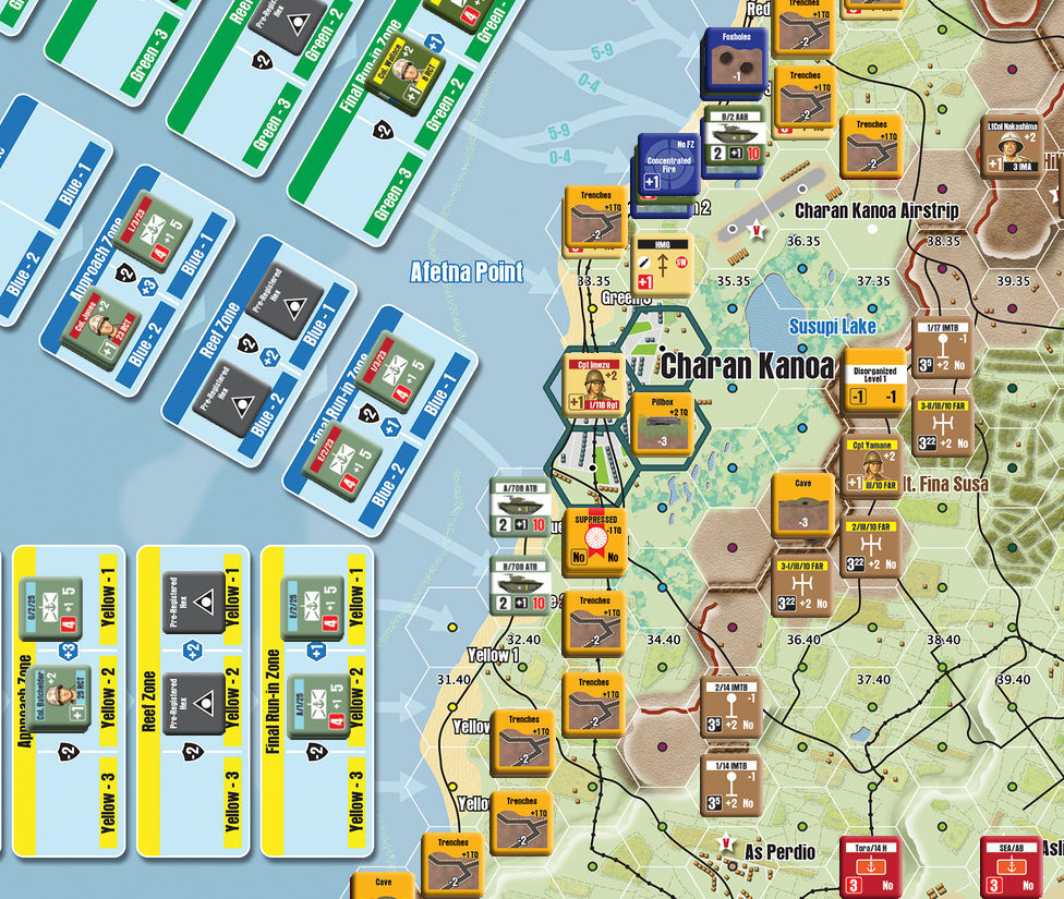 そう思っていた我々に朗報が届いた。CSSの最新版"Little Land"では、間接射撃に関するルールが改定されているとのこと。その改定内容は、「既に弾幕マーカーが置かれているヘクスに対しては、それよりも強力な弾幕マーカーを置く可能性がない限り砲撃マーカーを置けない」というものである。要するにあるヘクスに対して軽砲による間接射撃を行った場合、そのヘクスに対しては中砲又は重砲でしか砲撃できないというものである。海岸に集まる海兵隊に対して間接射撃を複数回加えることが難しくなったのだ。