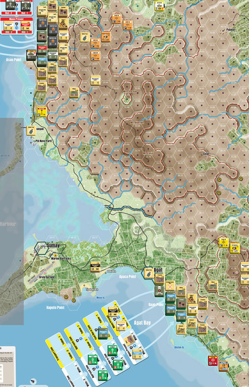 今回プレイするシナリオ5は、米海兵隊によるグアム島上陸当日を扱ったシナリオである。CSSのマリアナシリーズ(Saipan、Guam、Tinian)では、なんだかんだ言っても上陸当日を扱ったシナリオが一番面白い。この"Guam"では、米海兵隊は1個師団+1個旅団が登場し、それは第3海兵師団と第1臨時海兵旅団である。第3海兵師団の上陸地点は、アサン海岸(Adelup PointとAsan Pointの間)で、グアム島の西部中央部になる。一方、第1臨時海兵旅団は、アガット湾(Agat Bay)に上陸する。