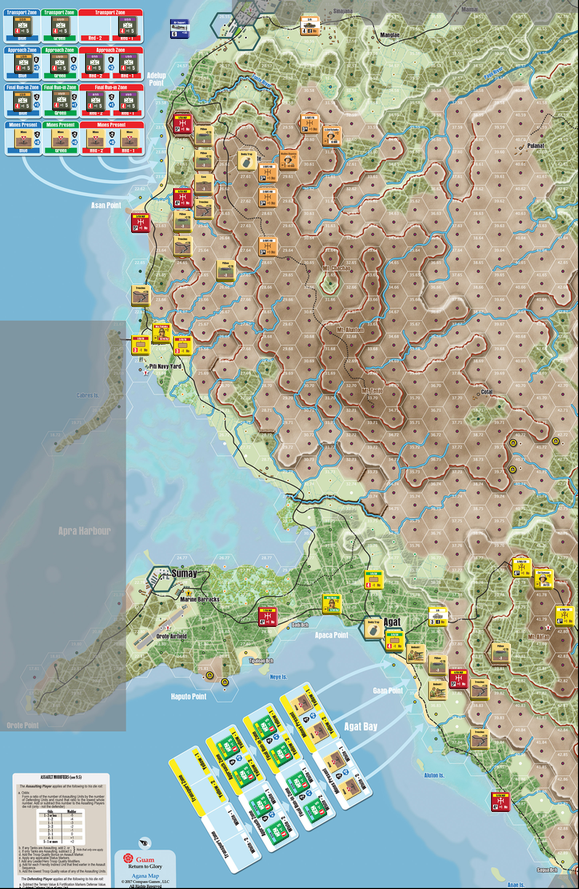 選んだゲームは、Compass Gamesの"Guam - Return to Glory"である。1944年7月~8月におけるグアム島の戦いを中隊規模で描いた作品で、CSS(Company Scale Serise)と呼ばれる共通のルールで構成されている。基本的なルールは、同じシリーズの Saipan を参照されたい。