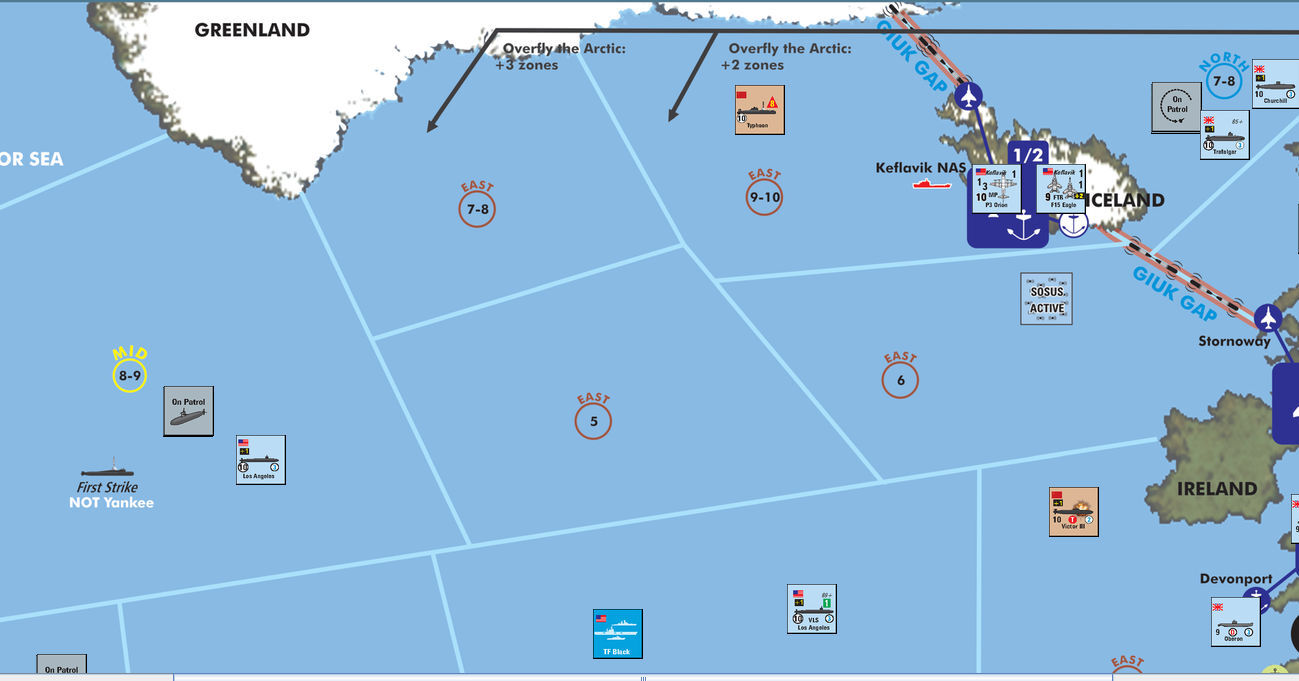 これまで大きな戦いがなかった米本土東岸沖であったが、このTurnの終了時点で第一撃ポイントの判定がある。米本土東岸沖に指定された「First Strike」エリアに展開したソ連側SSBNのペイロードが6ポイント以上の場合、ソ連軍は第1激ポイントを獲得できる。NATO側としては第一撃ポイントの獲得は何とか阻止したい。バミューダ近海で米ソの原潜部隊同士が激しく戦う。ヤンキー型旧式SSBNが早くも米原潜の攻撃を受けて数隻が撃沈されてしまう。