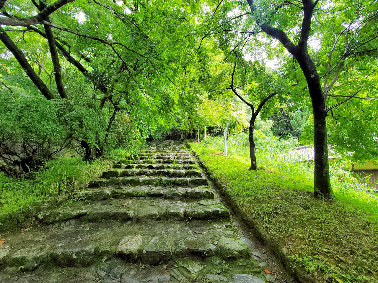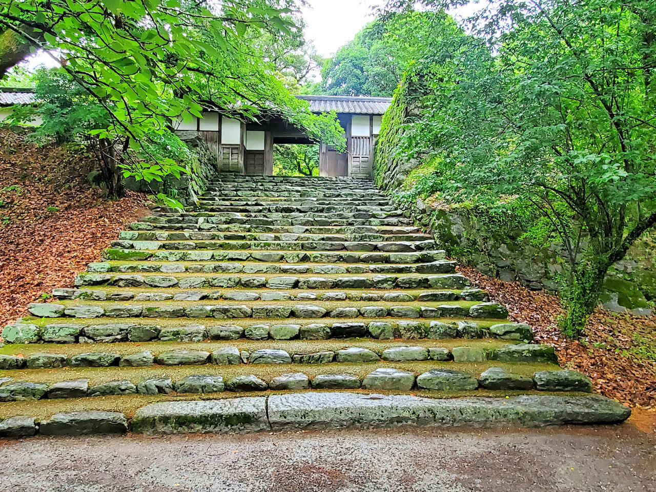 土塁の跡や、苔むした石垣の断片。どれも長い年月を越えて、静かにそこにある。雨に洗われたあとの景色は、どこか輪郭が柔らかく、すべてが穏やかに見えた。