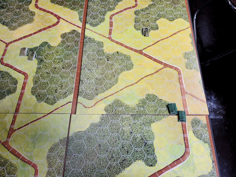 その後、T-62は盤端に向けて前進。陸自は戦車1両をその迎撃に向かわせます。マップの奧で交戦状態となった陸自とソ連軍。再び同時射撃。今度は両方とも狙いを外さず、各1両撃破。しかし自衛隊は戦車2両を失って残り1両。一方ソ連軍は戦車3両が残っているので、この時点で勝負あった。ダイス目に恵まれたソ連側の勝利です。