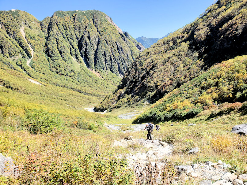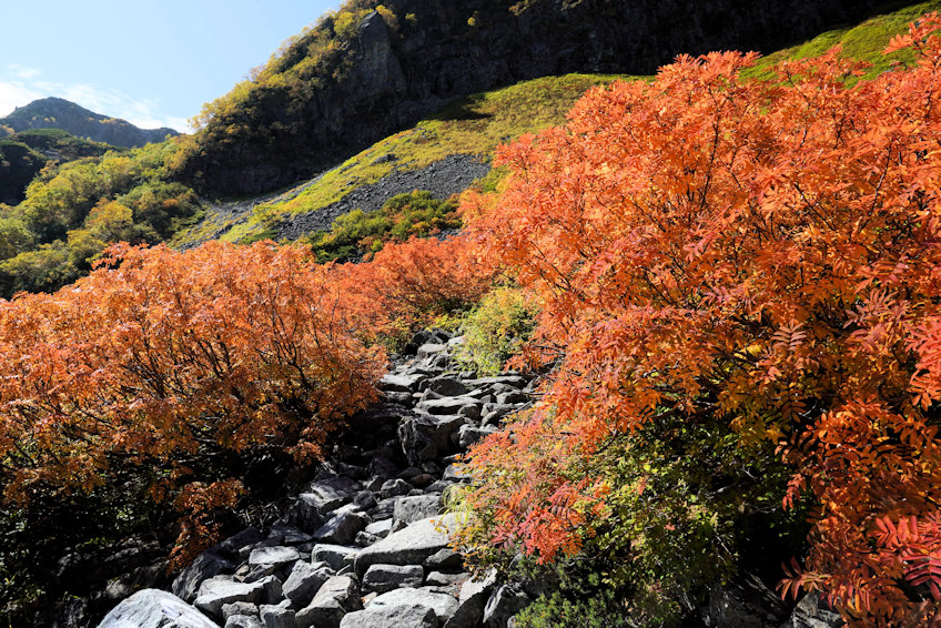 ここから斜面が急になり始めて左右の紅葉にも色がついてきます。