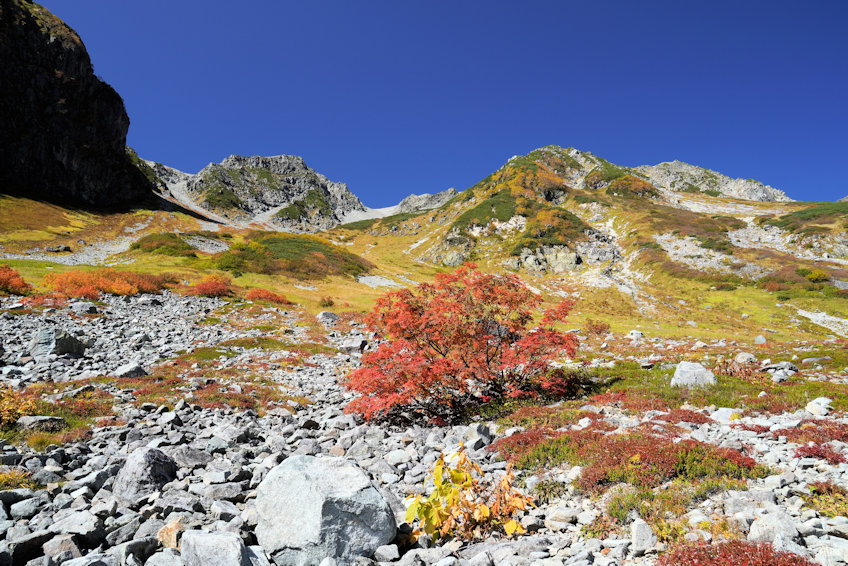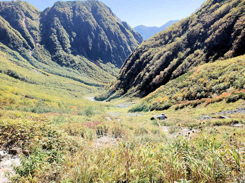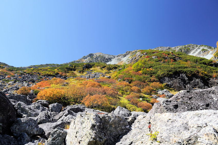 さらにそこから20分ほどで槍沢のキャンプ場に到着。ここから視界が開けて槍沢の景観が見えてきます。しかし残念ながらこの付近ではまだ紅葉は見えていません。